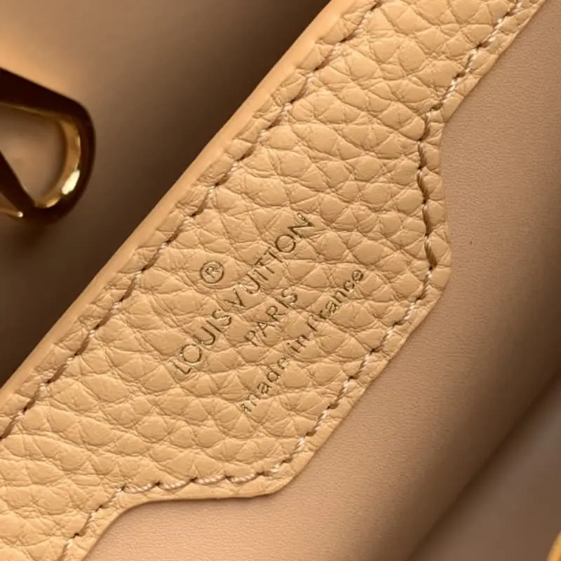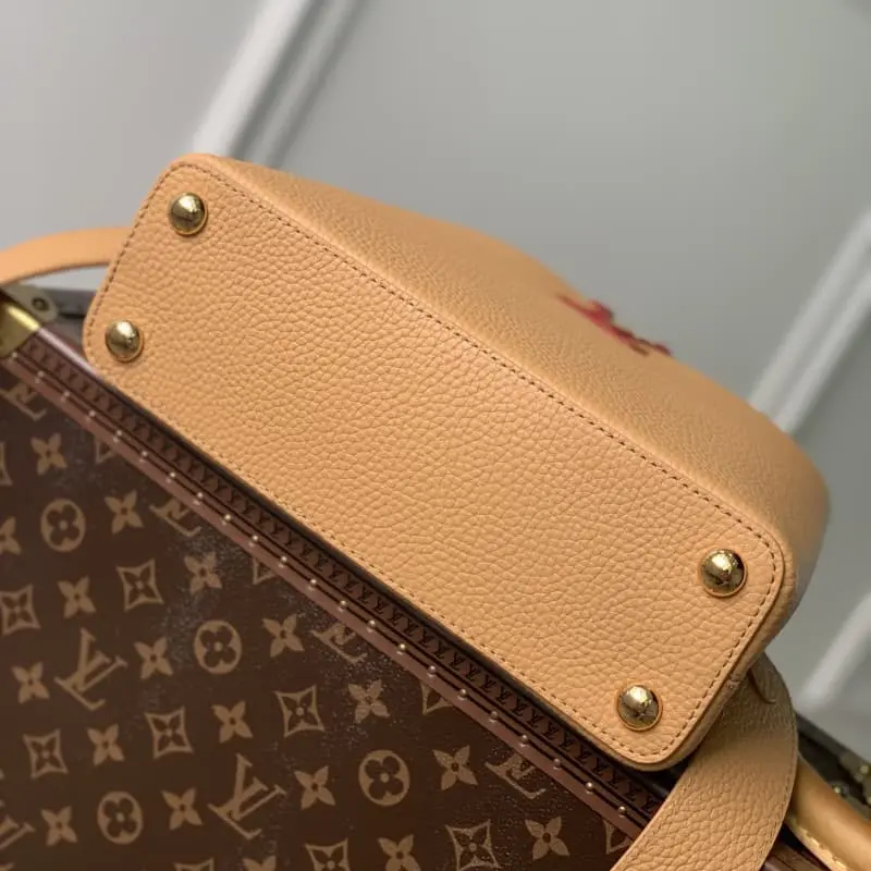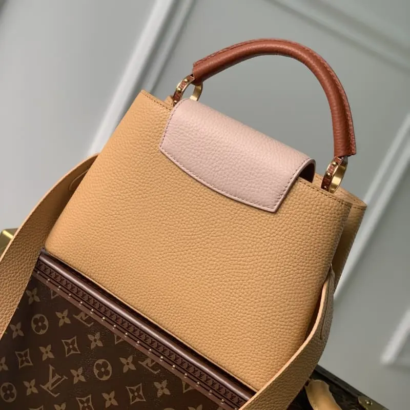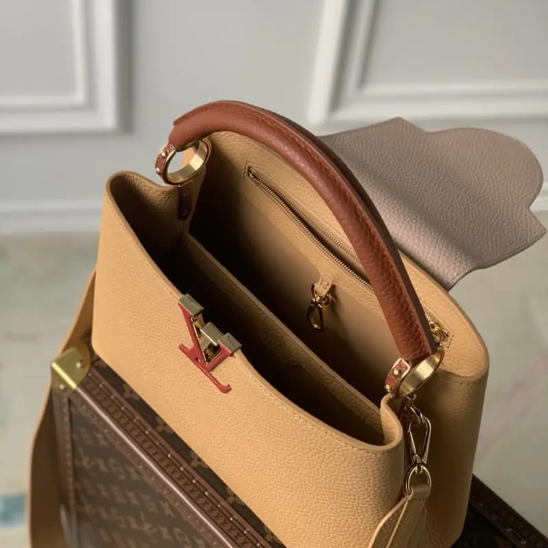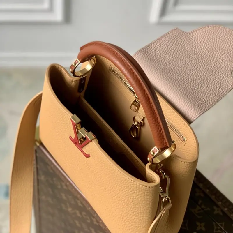 Model M20748 Brown and yellow Capucines BB handbag, small size. French imported calfskin, shiny metal accessories, unique Capucines flap can be put inside the bag to display the letter logo, and can be turned out to show the Monogram Flower pattern. Size: 27 x 18 x 9cm