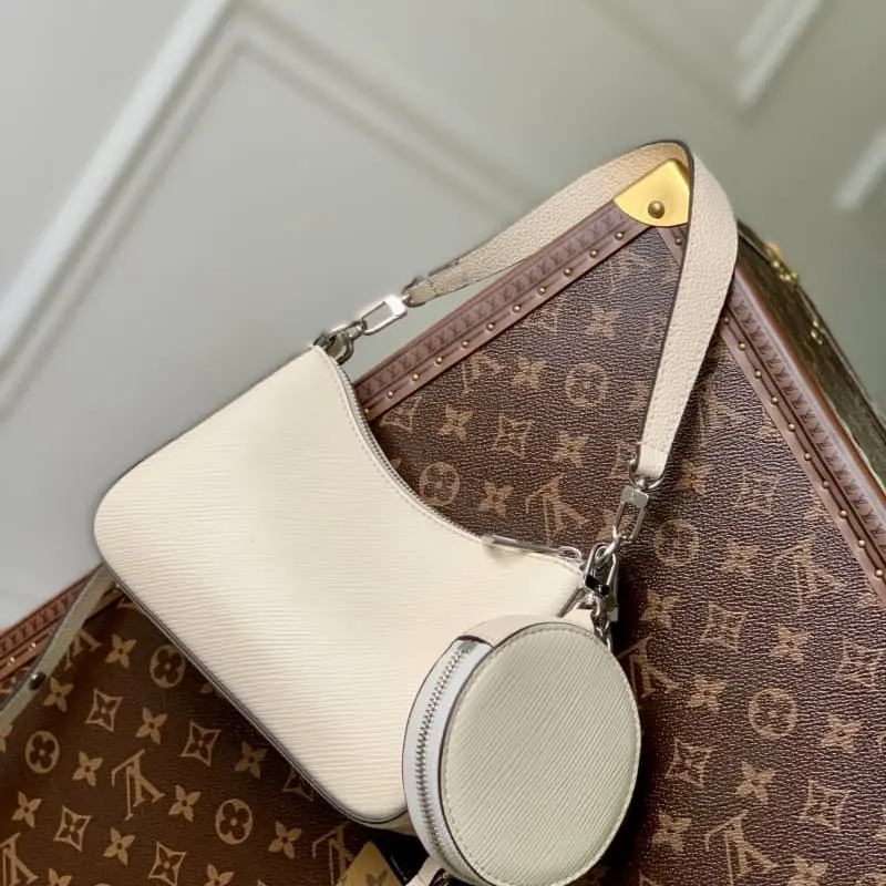 The M20999 white Marellini handbag uses Lbag’s iconic Epi leather to integrate the dynamic elements of the Marelle handbag into a more compact configuration. The round coin purse can be removed at will. The mirror fixed to the bag body by a chain is housed in the front patch pocket. 19.0 x 13.5 x 6.5 cm (length x height x width)