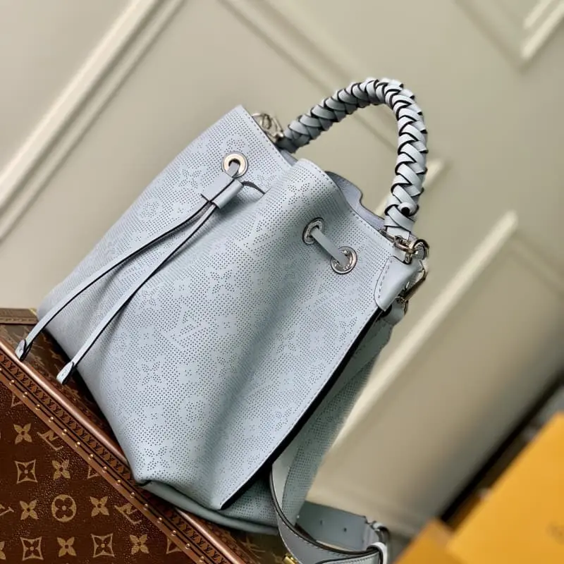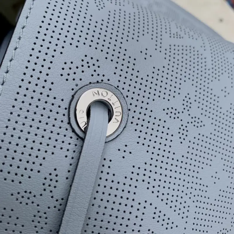 M21006 Blue Leather Bucket Bag Series M55800 MURIA Handbag This Muria Bucket Bag is made of perforated cowhide leather, giving the Monogram perforated pattern a metallic sheen, paired with a leather name tag and key bag. Use the braided handles and adjustable long leather shoulder strap to explore long or short shoulder and crossbody styles. Detailed Features 25 x 25 x 20 cm