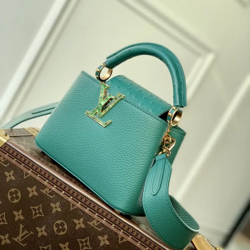 [Exclusive real shot model M21164 dark green with ostrich shell buckle mini] Capucines mini handbag French imported calfskin, shiny metal accessories, unique Capucines flap can be put inside the bag to display the letter logo, and can be turned out to show the Monogram Flower pattern size: 21x14x8 cm