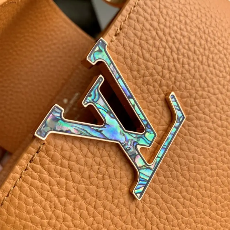 Top-grade original M21168/turmeric and green mother-of-pearl. This Capucines mini handbag uses elegant colors to depict the Taurillon leather body, and then cuts the flap and top handle with ostrich leather, which complements the delicate shell of the letter V and highlights the aesthetic perspective of Louis Leather Color Master Size: 21 * 14 * 8 cm