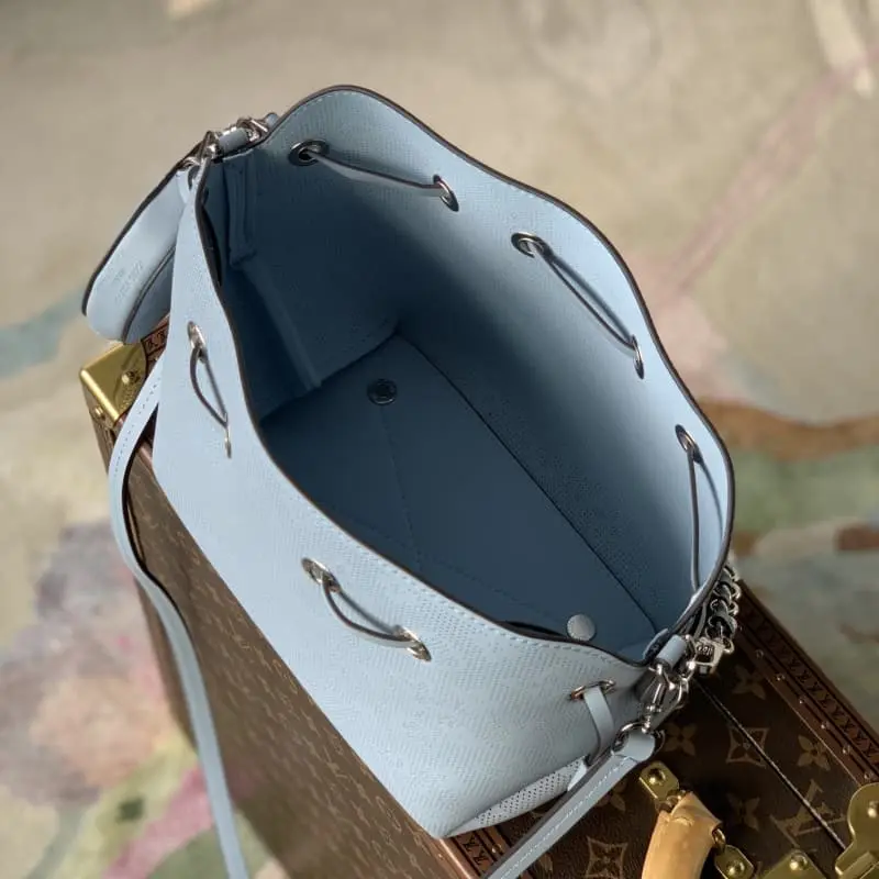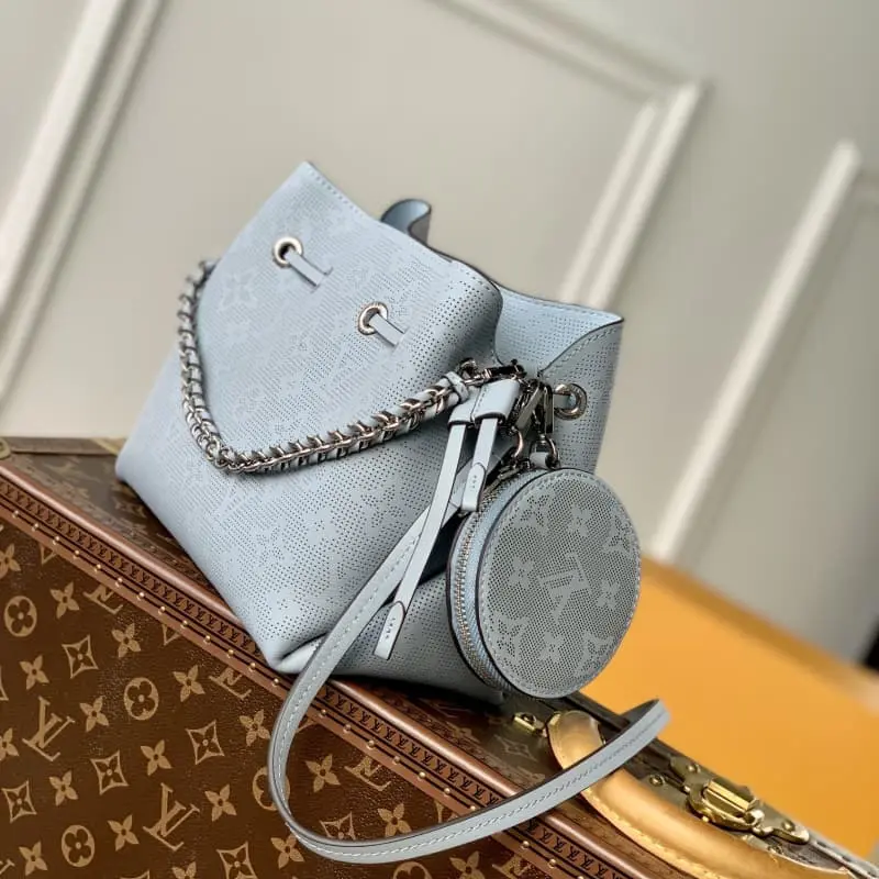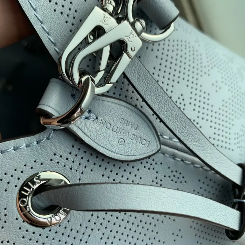 M21582 This Bella bucket bag with coin purse is made of Mahina cowhide leather. The flat LV and Monogram floral patterns are surrounded by more than 60,000 special perforations. The same color leather trim and metal parts complete the overall design. It is equipped with braided handles and adjustable and removable leather shoulder strap. Dimensions: 19.0 x 22.0 x 14.0 cm (length x height x width)