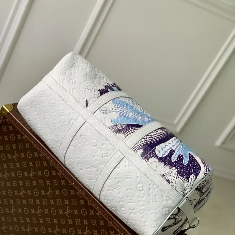[Exclusive real shot M21678] LV x YK Keepall 50 travel bag is from the Lbag x Yayoi Kusama collaboration series. Thousands of dots interweave to create a psychedelic floral outline, symbolizing the brevity of life and the infinity of time, representing the well-known creative imagery of this Japanese artist. The LV x YK logo points out the identity of the series and makes it another collection choice. Detailed features 50 x 29 x 23 cm (length x height x width) [Warm reminder This model is too big to be packaged