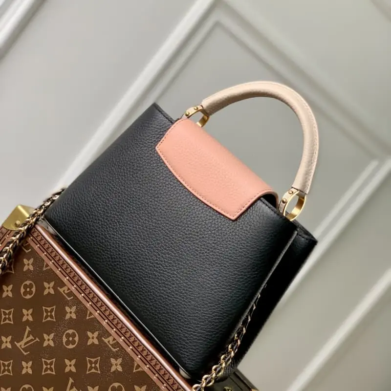 M21689 Black This Taurillon leather version of the Capucines small handbag presents a soft and fresh color that is eye-catching. In addition to the iconic top leather handle, it is also equipped with a removable and adjustable braided leather chain bag strap for shoulder or crossbody. The bag has a compartment and a zipper pocket to store valuables. Detailed Features 27 x 18 x 9 cm (length x height x width)