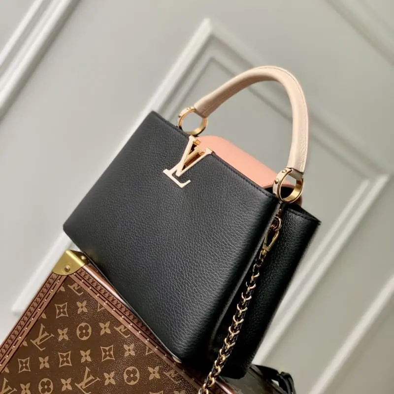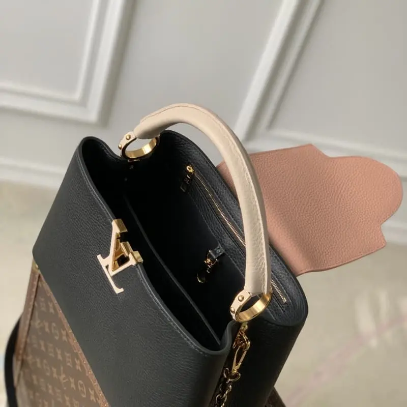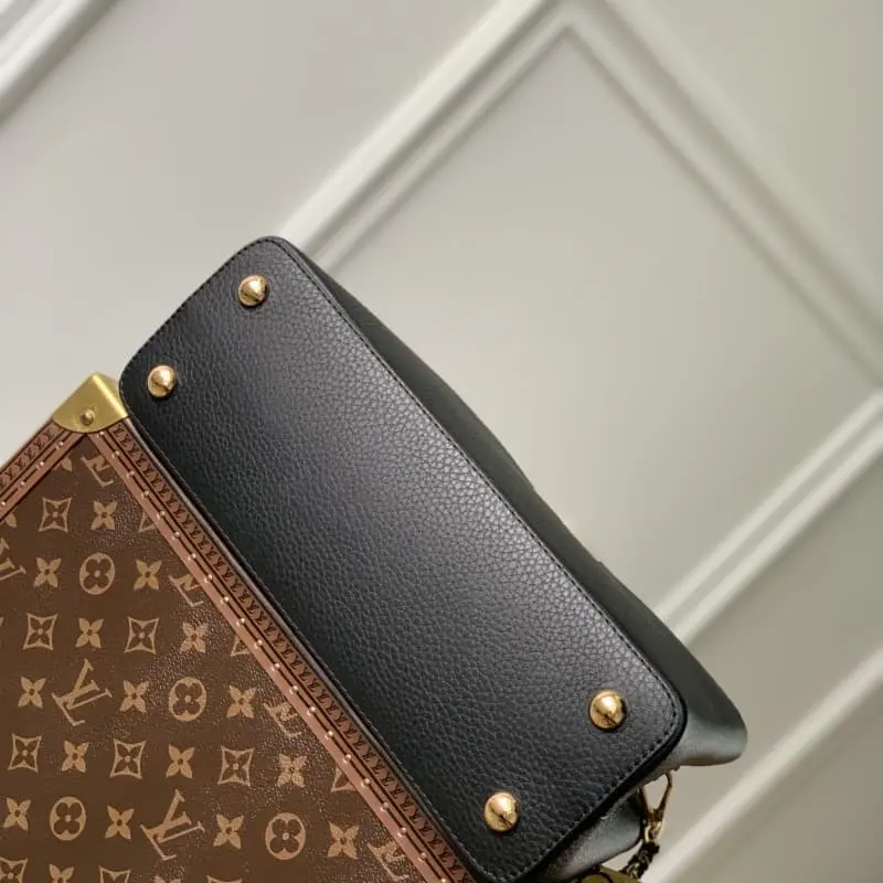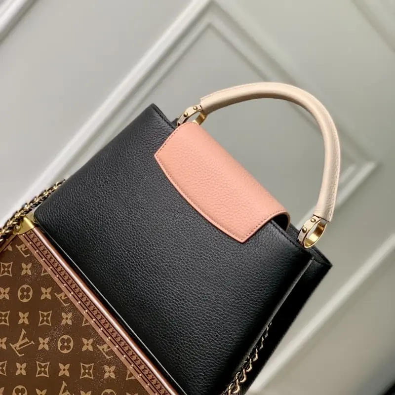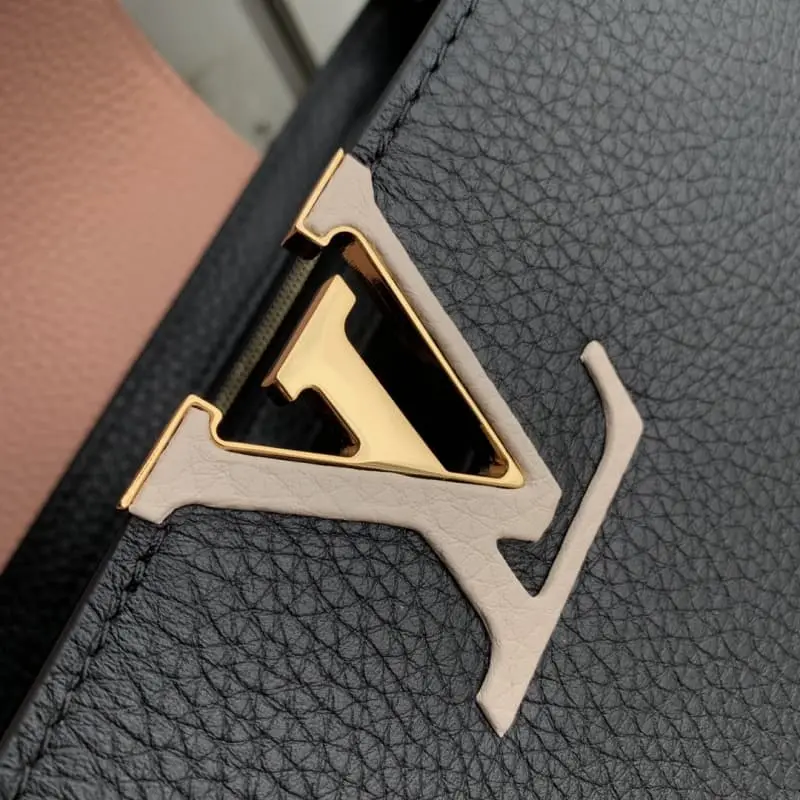 M21689 Black This Taurillon leather version of the Capucines medium handbag presents a soft and fresh color that is eye-catching. In addition to the iconic top leather handle, it is also equipped with a detachable and adjustable braided leather chain bag strap for shoulder or crossbody. The bag has a compartment and a zipper pocket to store valuables. Details 31.5??20??11cm (length x height x width)