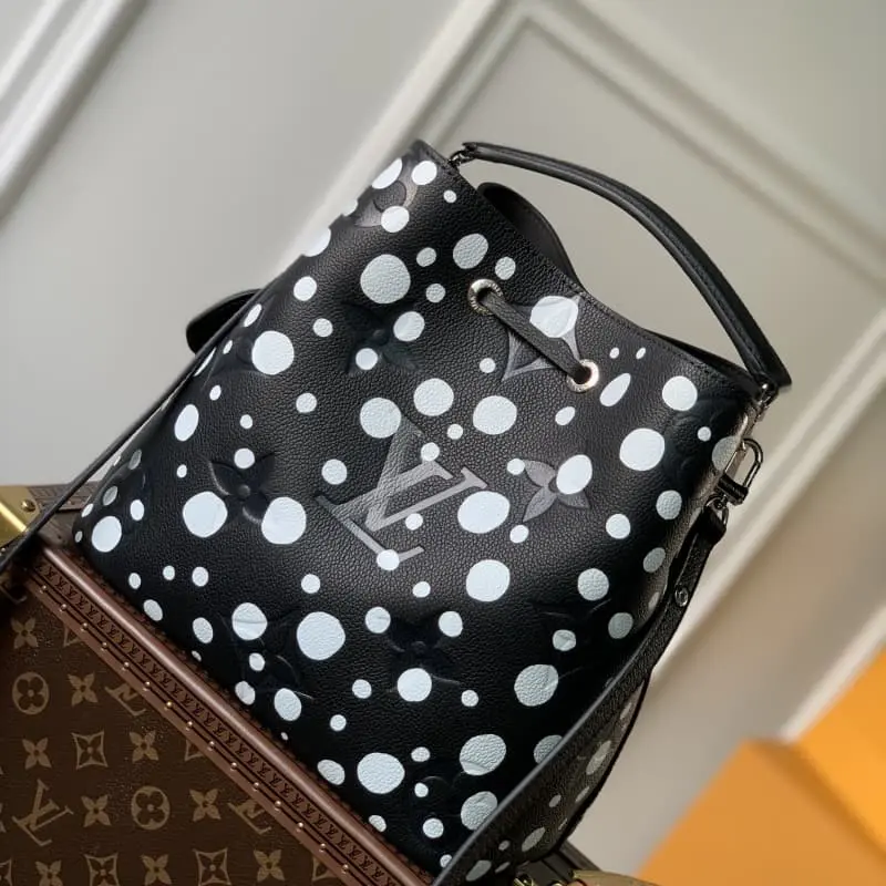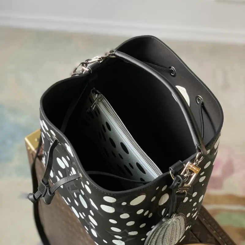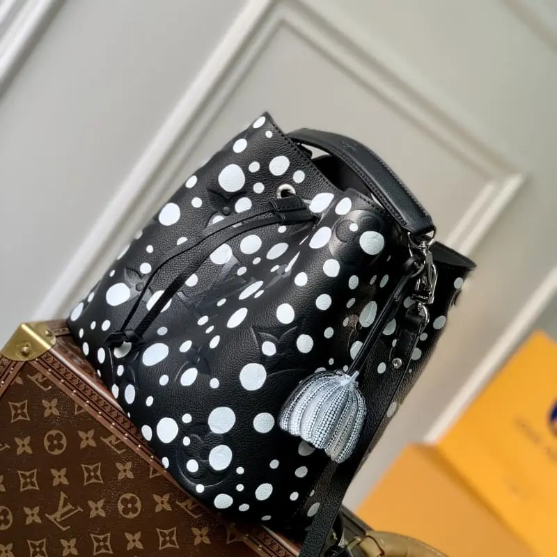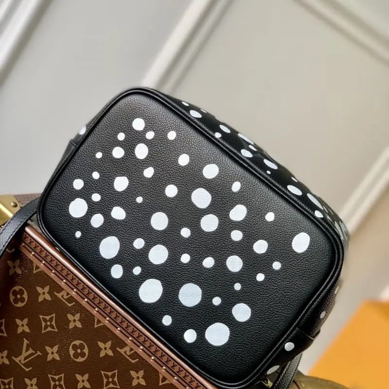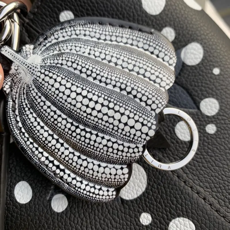 M21753 LV x YK N??oNo?? Medium Handbag from Lbag x Yayoi Kusama collaboration series condenses the creative energy of the infinite polka dot world. Monogram embossed cowhide leather reflects Yayoi Kusama’s iconic polka dots. The detachable pumpkin-shaped decoration adds to the artist’s visual business card. 26.0 x 26.0 x 17.5 cm (length x height x width)