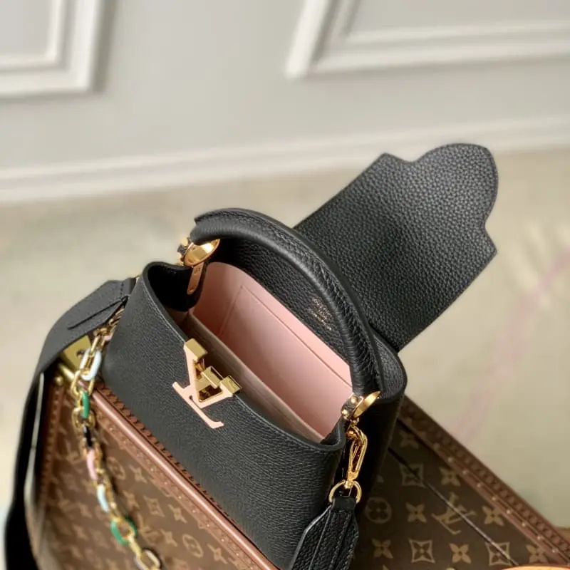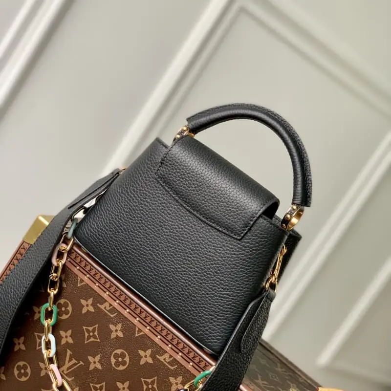 Top-grade original M21798. Black gold buckle This Capucines mini bag interlocks metal and resin links to add a touch of fun to the classic design. Removable chain. Taurillon leather presents a lustrous look. Place the flap inside to show it off. LV logo style. Detailed features 21 x 14 x 8cm (length x height x width)
