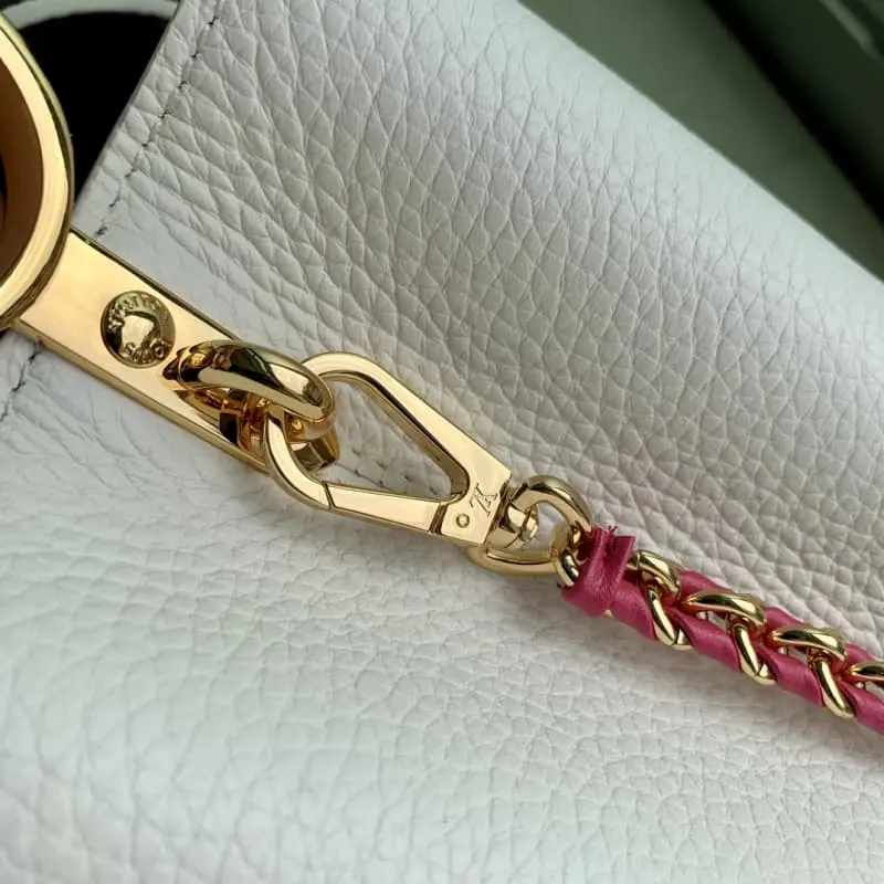 M22122 Capucines Capushell small bag in white with a wavy bottom. The Capucines design is renewed by using a thermoforming process to heat the Taurillon leather. After molding and cooling, it creates a shell-like shape. Size: 27??18??9cm