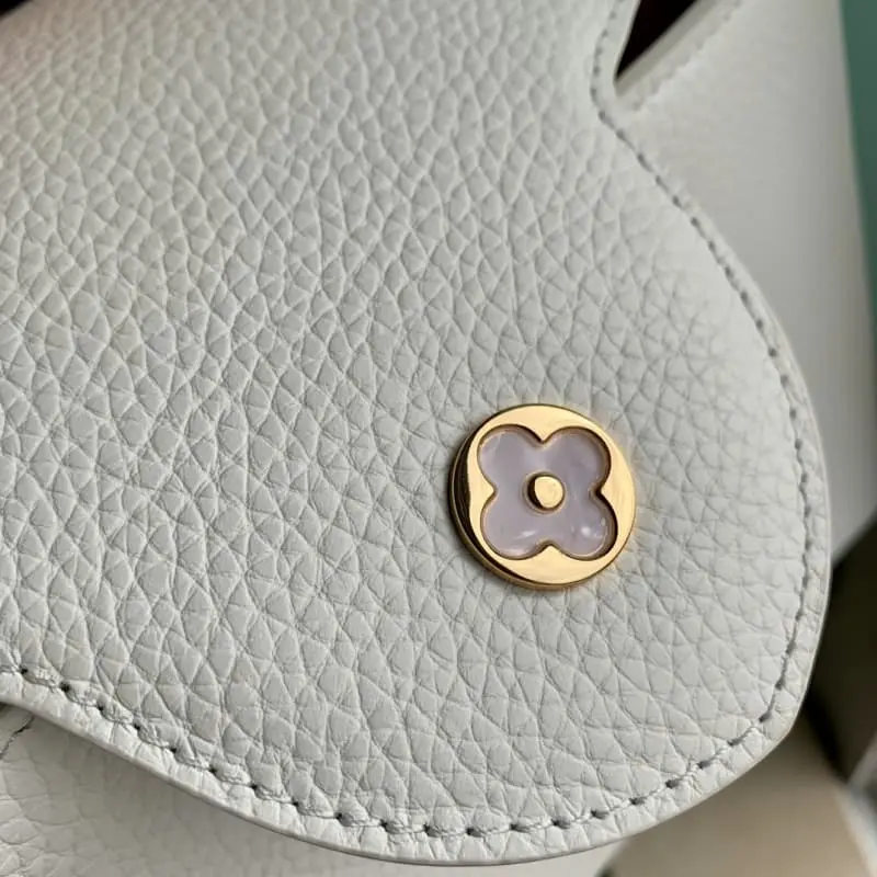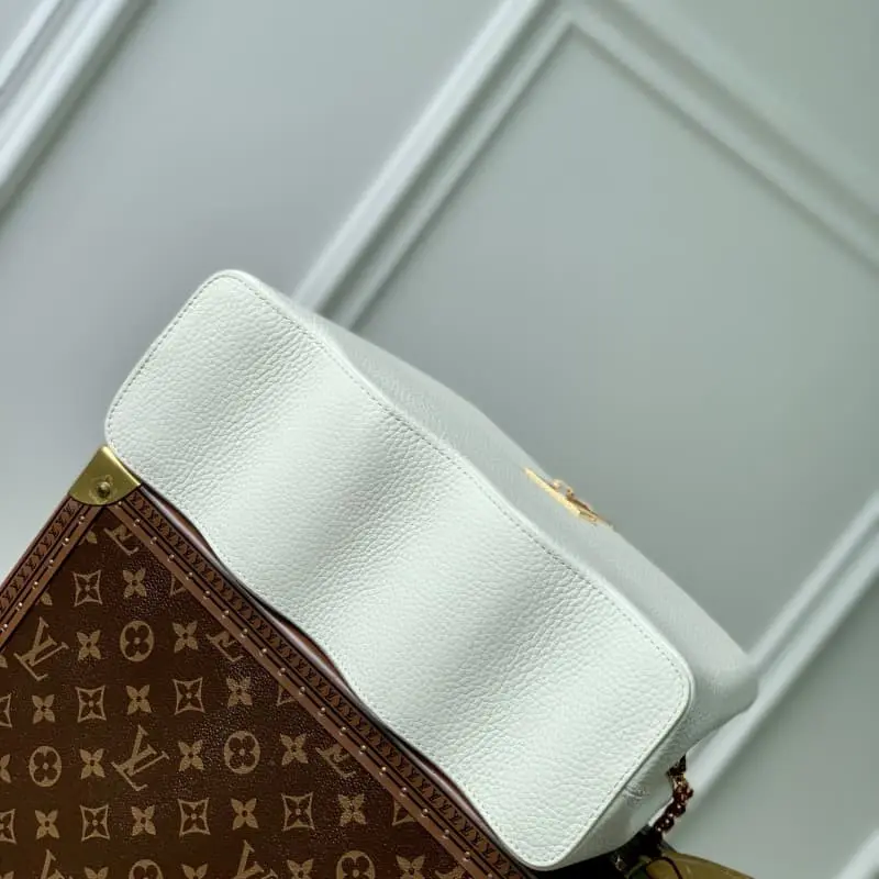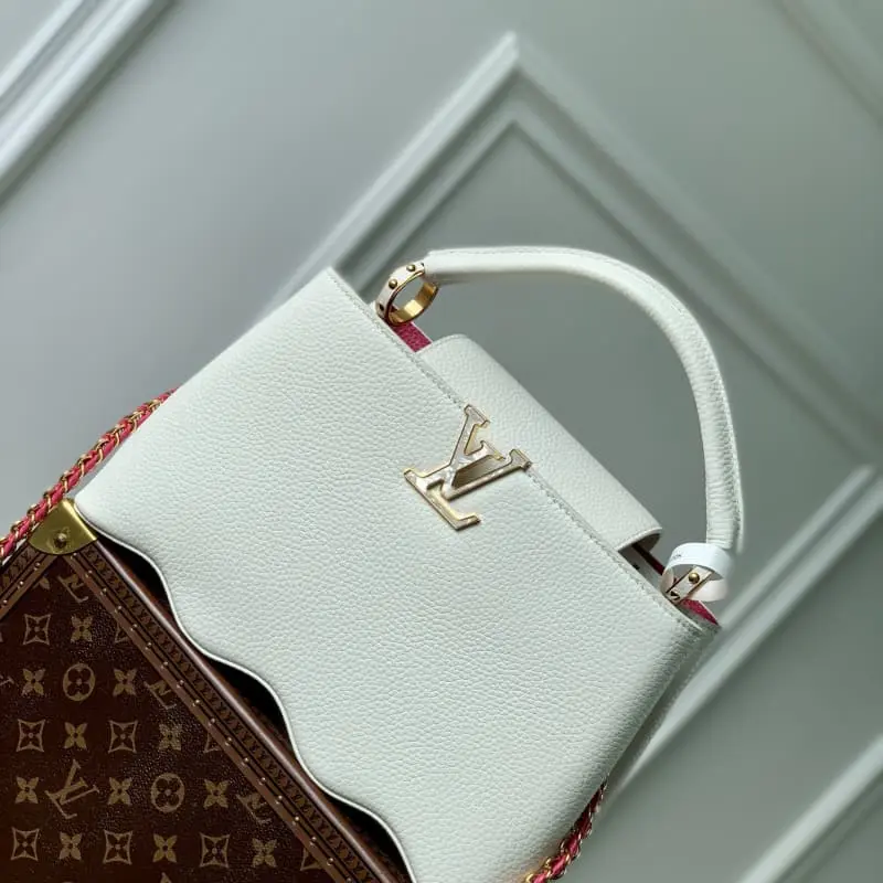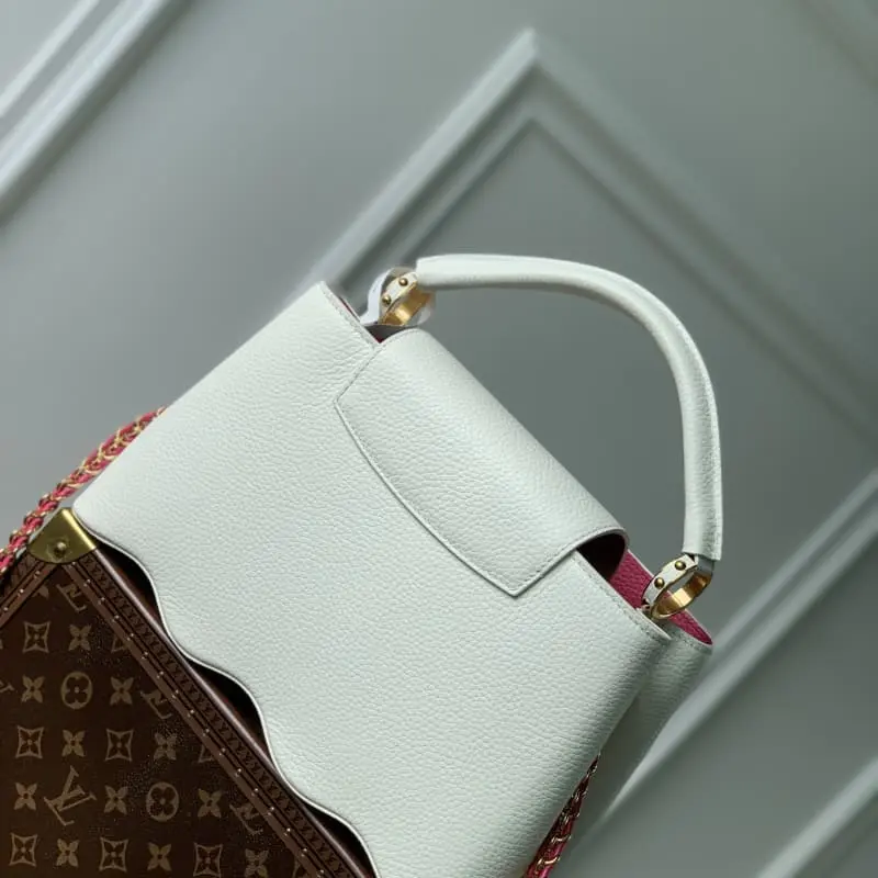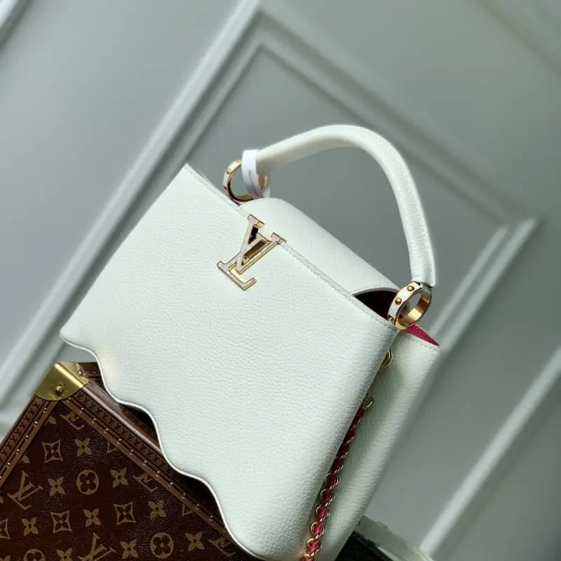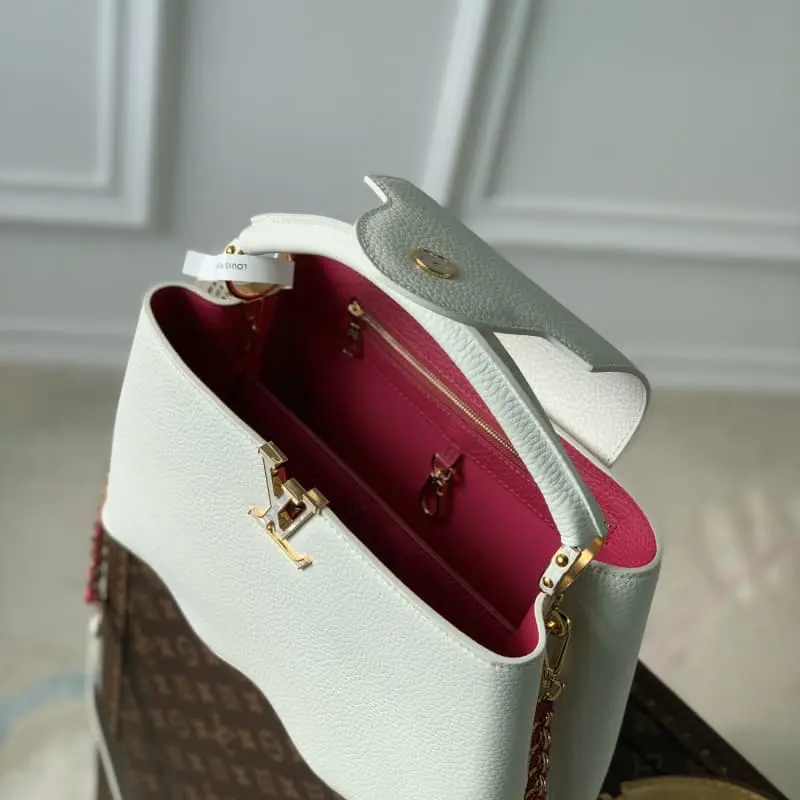 M22122 White Capucines Capushell Medium Handbag with a wavy bottom. The Capucines design is renewed. The Taurillon leather is heated by thermoforming. After molding and cooling, it is formed into a shell-like shape. Size: 31.5??20??11cm