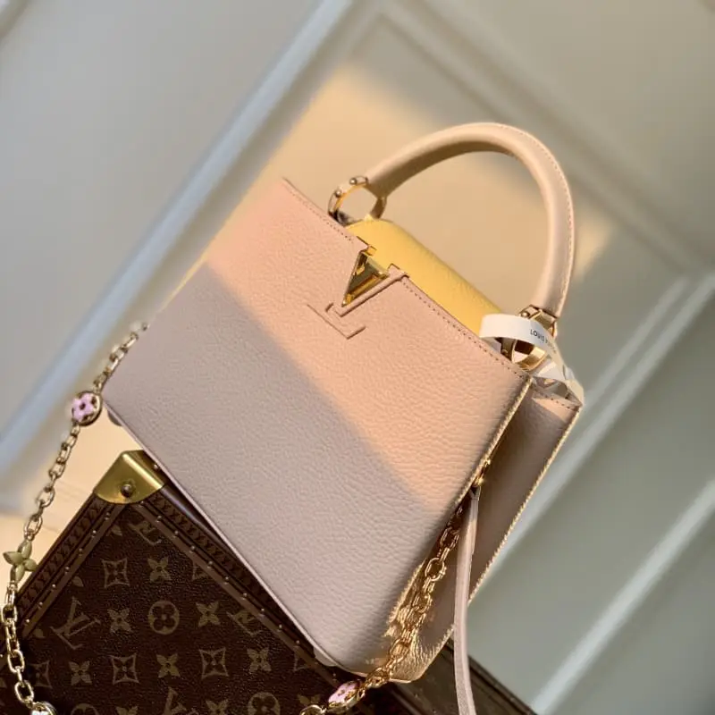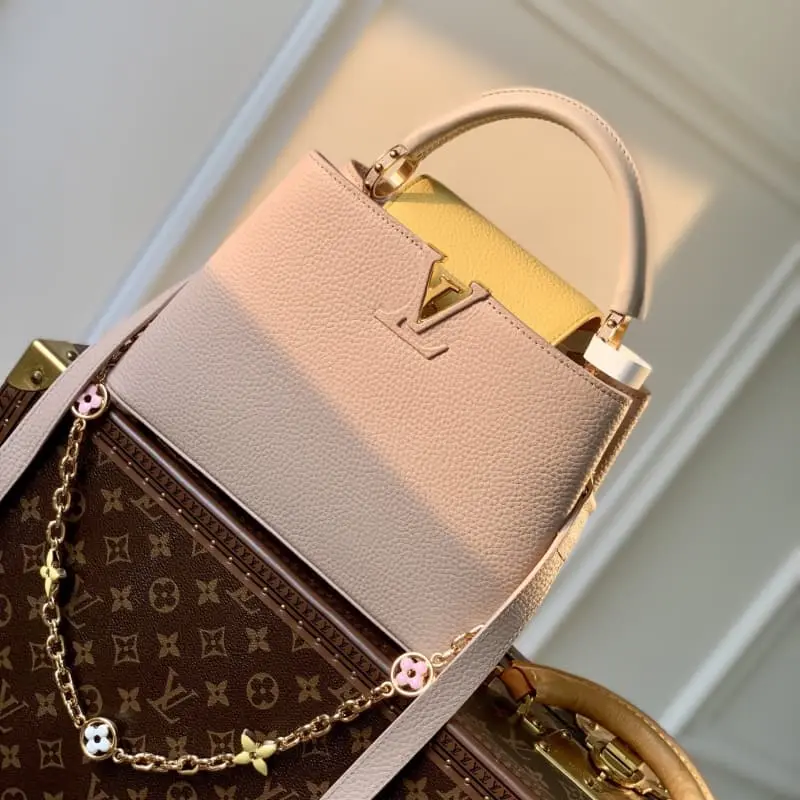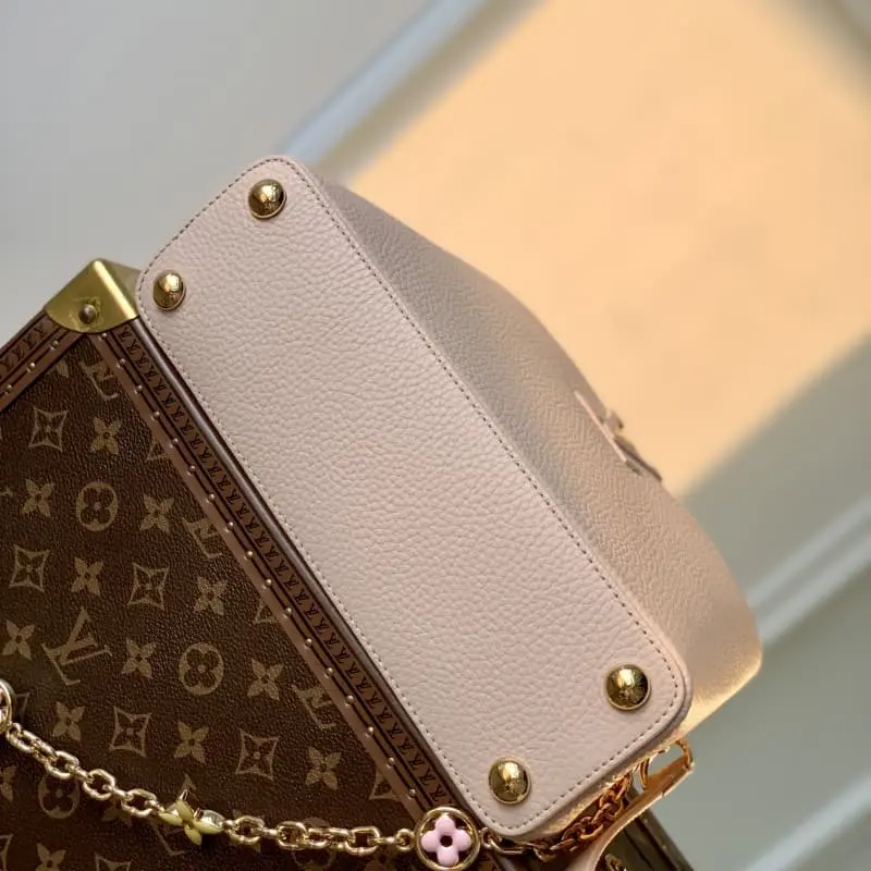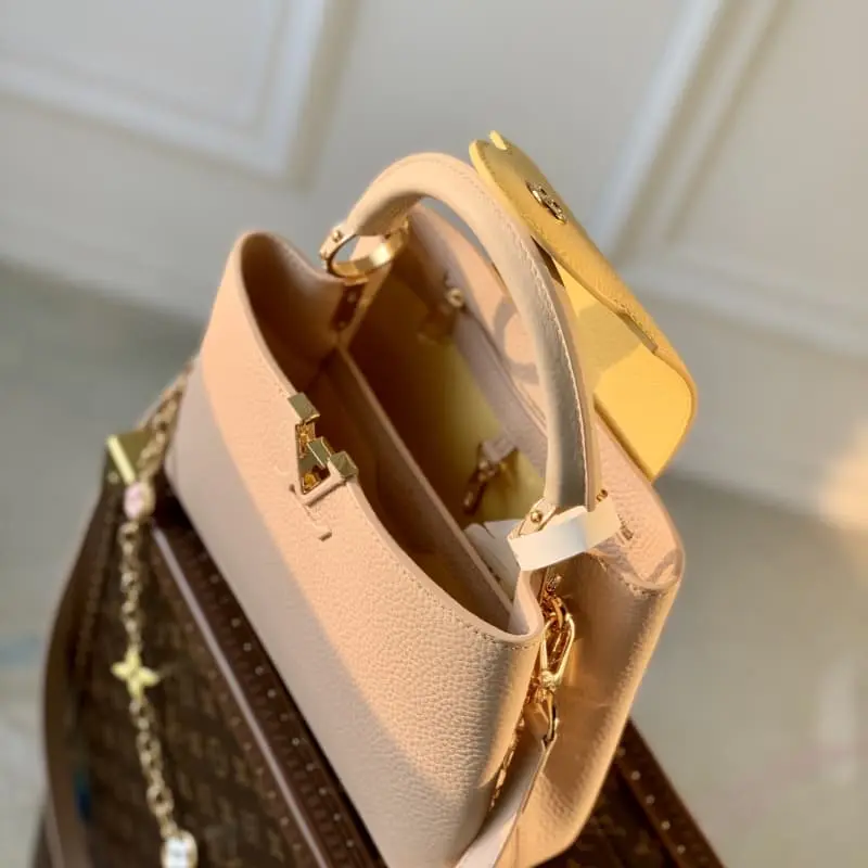 [Exclusive real shot of M22375 apricot small] This Capucines small handbag is dyed with soft colors to make the classic silhouette more eye-catching. The exquisite chain strung the metal Monogram flowers, each of which was molded, enamel-injected and hand-polished to sparkle brilliantly. The flap can be placed outside or retracted to show the LV logo. Size: 27??18??9cm