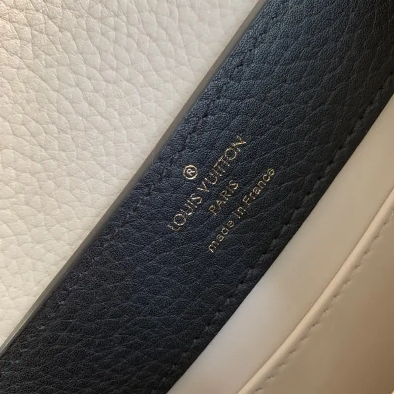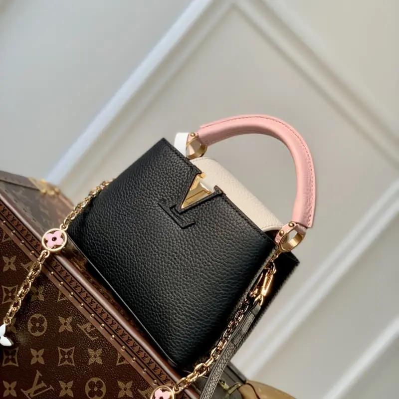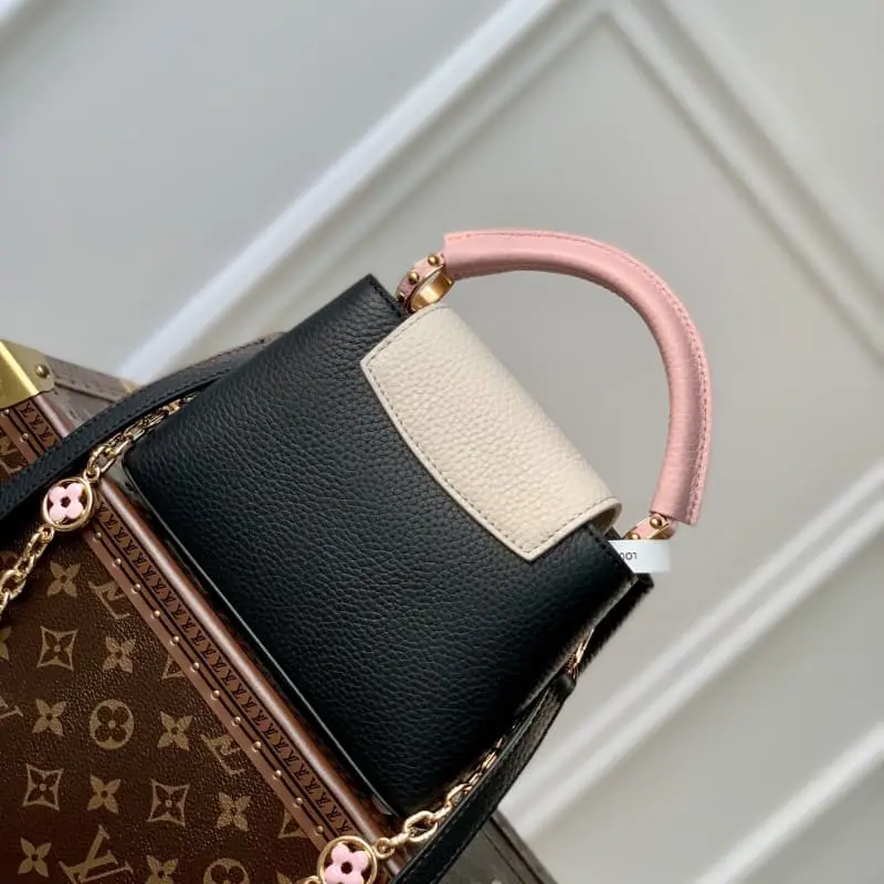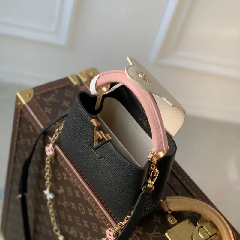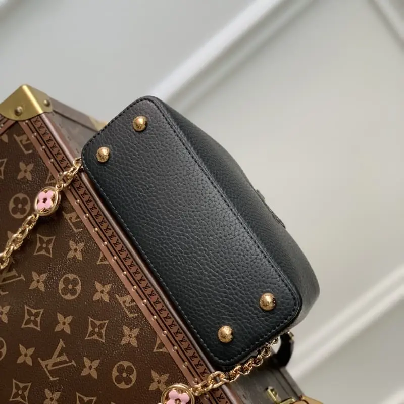 M22375 Black Mini This Capucines mini handbag is dyed with soft colors to make the classic silhouette more eye-catching. The exquisite chain strung the metal Monogram flowers, each of which was molded, enamel-injected and hand-polished to sparkle brilliantly. The flap can be placed outside or retracted to show the LV logo. size: 21??14??9cm