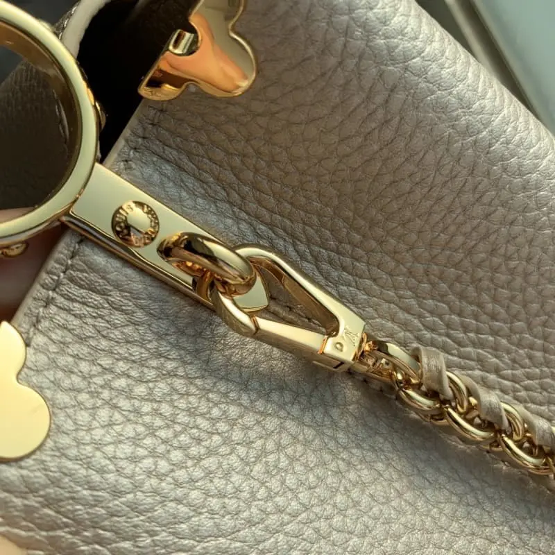 The M22436 pearlescent khaki flower crown CAPUCINES handbag tells a new Capucines story this season. The exquisite metallic Monogram floral ribbon makes this classic handbag exude a more feminine temperament. Medium size The exquisite black body with golden flower crown decoration is elegant and practical Medium size 31.5??21??11cm