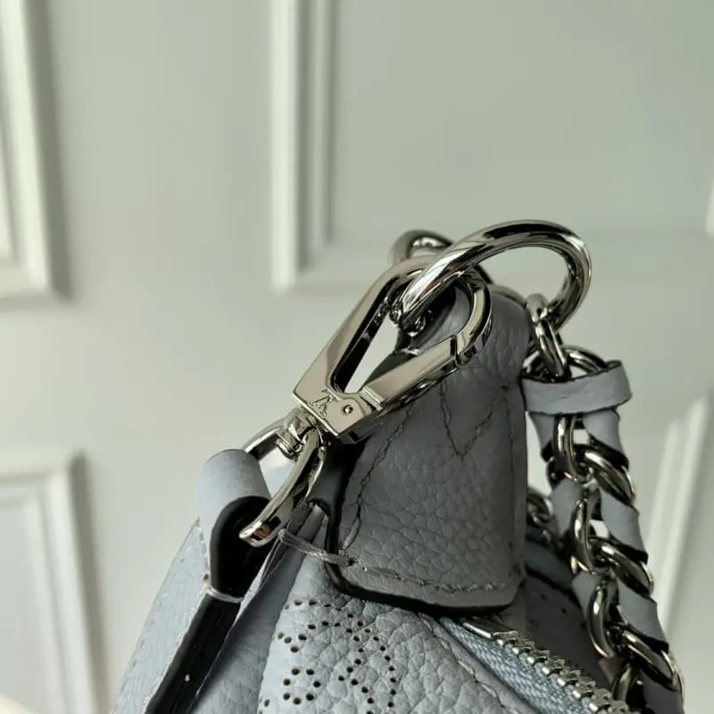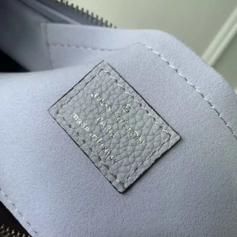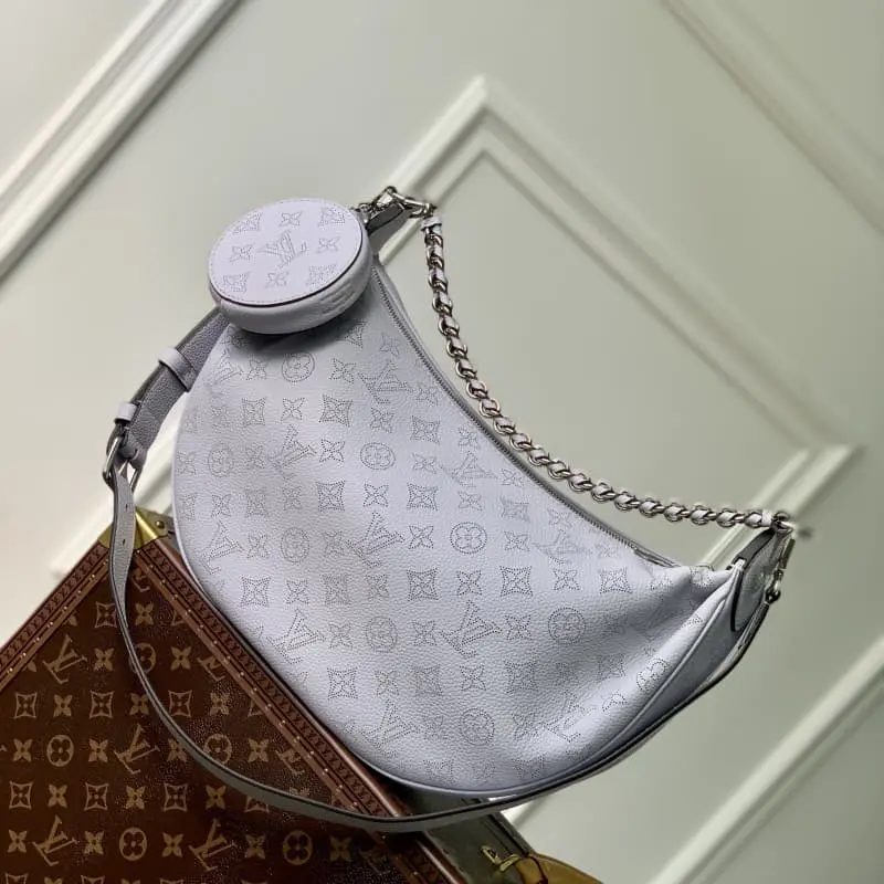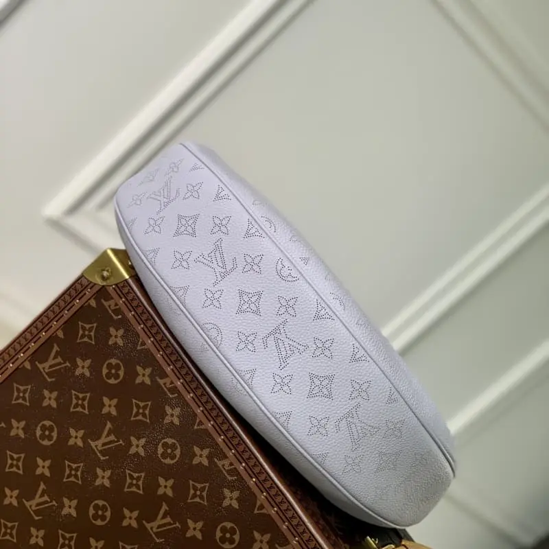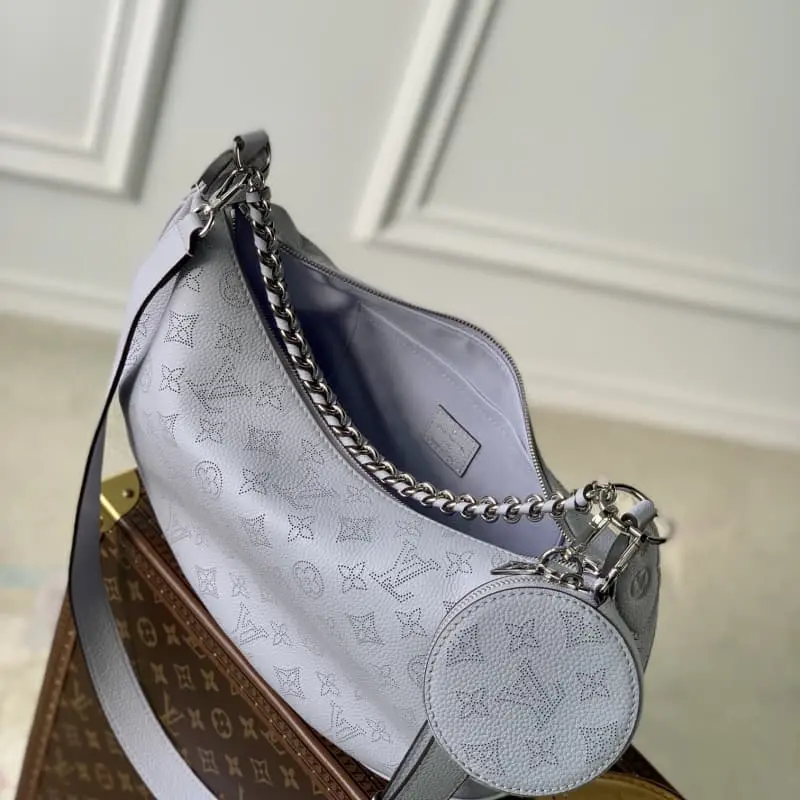 The purple Baia medium handbag M22822 has the drape of leather and a soft, close-fitting half-moon shape to join the Mahina series. The round coin purse highlights classic details and the ample configuration fits the rhythm of urban life. The leather and metal braided handles combined with the adjustable shoulder strap allow for multiple carrying methods. 36.5 x 23.0 x 8.0 cm (length x height x width)