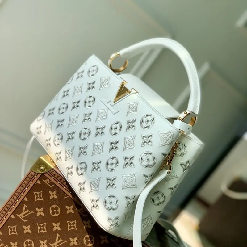 M22863 Embroidered white Capucines handbag made of cowhide leather elegantly integrated with complex embroidery to highlight the Broderie Anglaise theme of the 2022 early autumn series. The cowhide body is decorated with Monogram perforated pattern. The embroidery stitching on the edge reinforces the hollow structure to achieve an exquisite design. Medium size 31.5x20x11cm