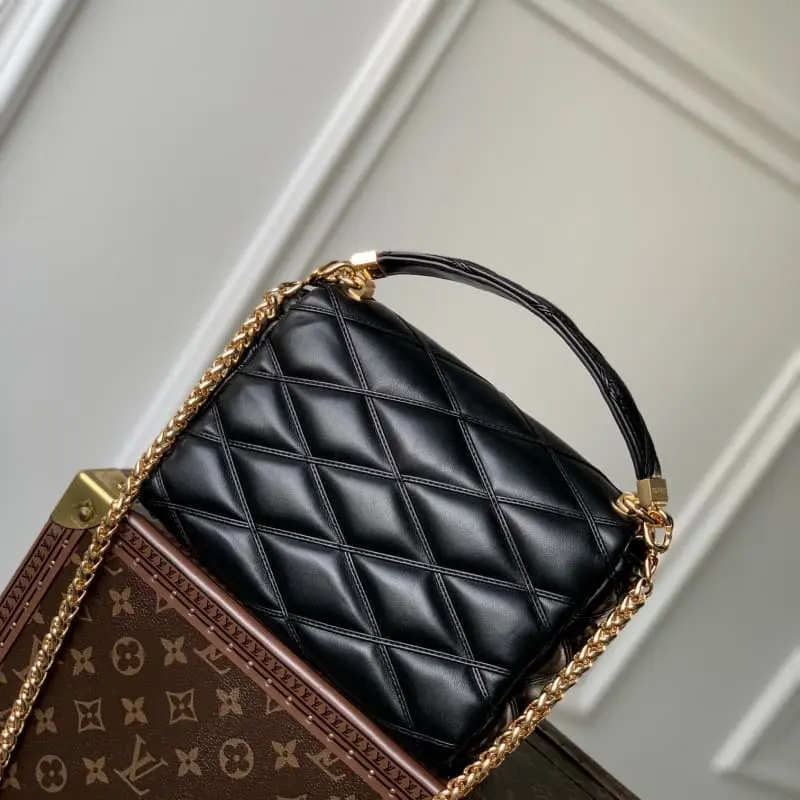 M22891 Black GO-14 Medium Handbag Made of luxurious sheepskin, the quilted pattern pays tribute to the brand’s traditional luggage design. The LV Twist lock highlights the eye-catching style. The top handle can be carried alone or transformed into a sliding chain shoulder strap. The leather shoulder pad allows for a comfortable shoulder or crossbody experience. 23.0 x 16.0 x 10.0 cm (length x height x width)