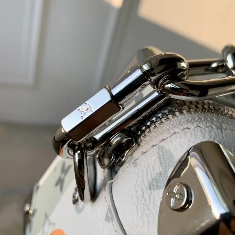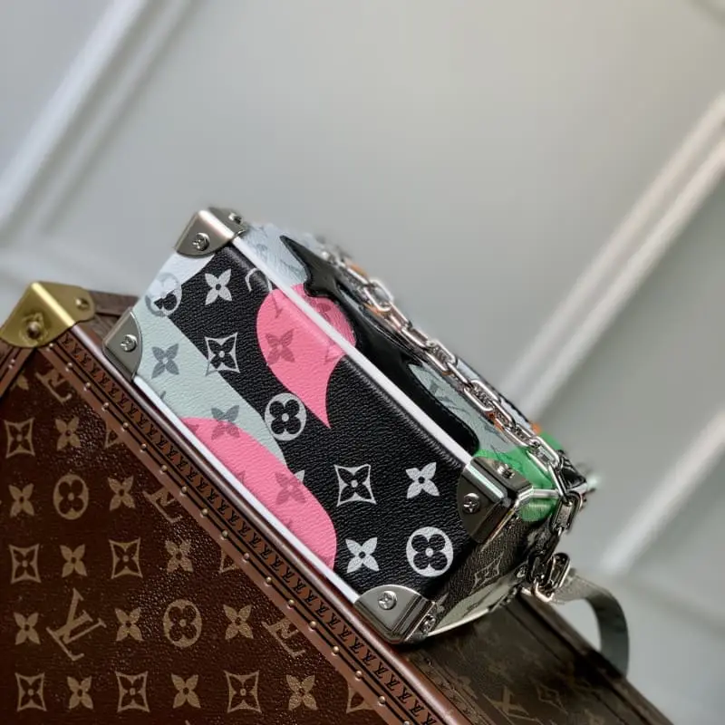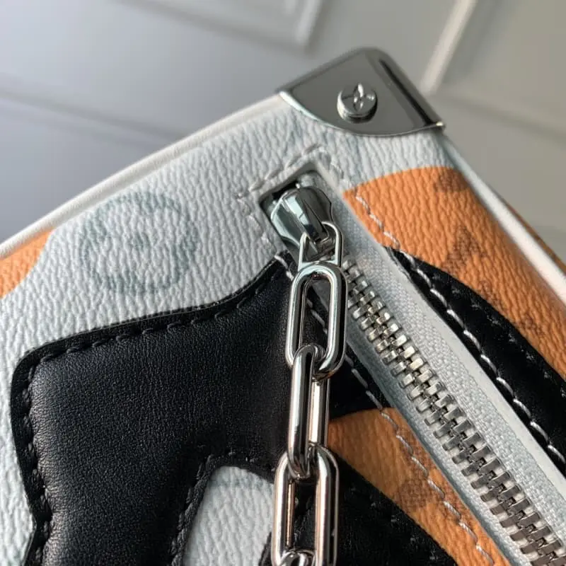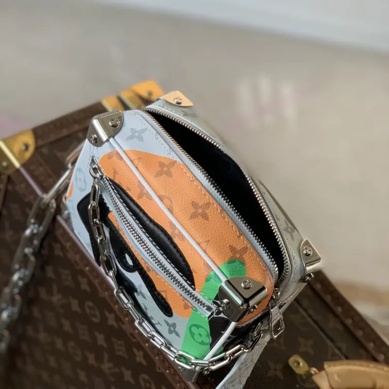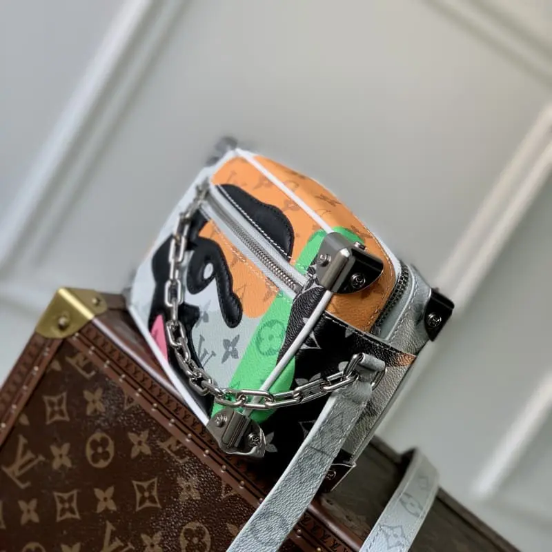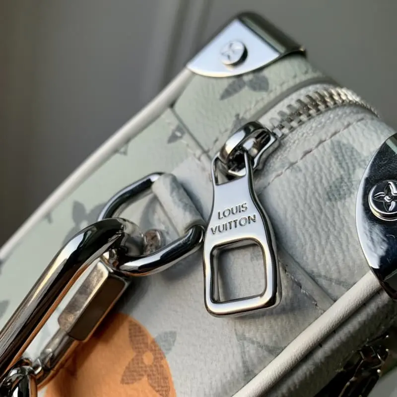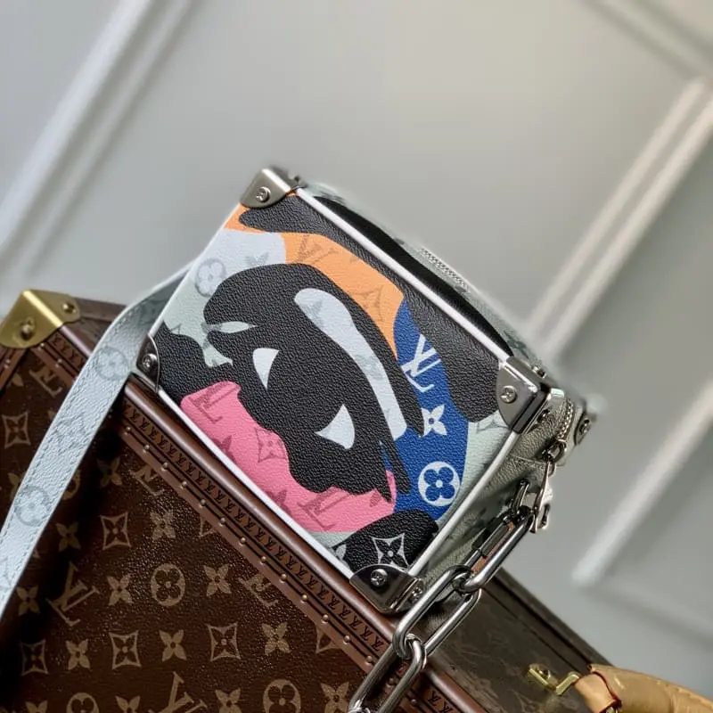 M23144 White Flower Men’s Bag Box Bag Series Mini Soft Trunk Handbag This mini soft trunk handbag combines canvas and leather. The color block print creates a face image. The sewn eye-shaped leather patch adds a vivid touch. The reinforced corners, decorative chain and chain part of the adjustable shoulder strap are in the same color. 18.5 x 13 x 8 cm