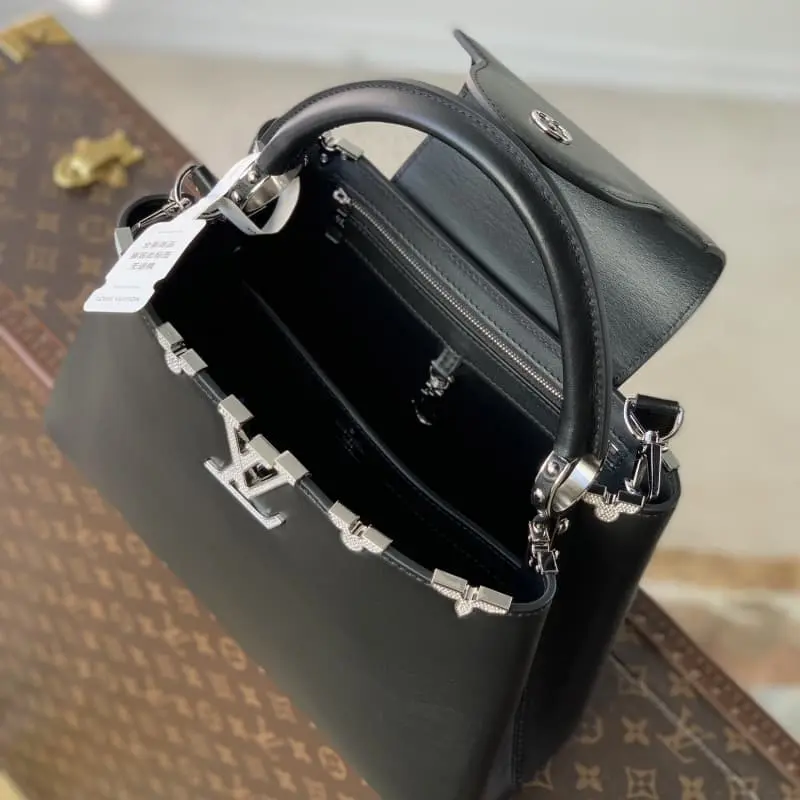 M23263 Black Medium Full Leather Cap Na Ying Series CAPUCINES Medium Handbag This Capucines Mini Flower Crown Handbag is made of full-grain Taurillon leather and embellished with Monogram flowers, each of which is made of delicate shells. The LV logo and flowers echo each other, making this feminine handbag exude a jewel-like luster. Cleverly use the detachable shoulder strap to switch between shoulder and crossbody. 31.5??21??11 cm.