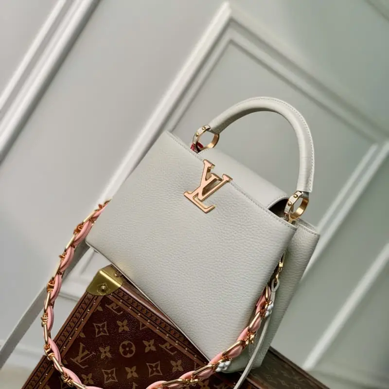 M23363 Grey Na Ying Series Capucines Medium Handbag M48865 This season’s new Capucines handbag highlights femininity Metal links and elegant soft cowhide leather are woven into exquisite chains with enamel and veneer Monogram Dhlo flowers scattered on them. The enamel brand logo highlights the jewelry texture and makes the handbag even more beautiful. Size: 21 x 14 x 8 cm