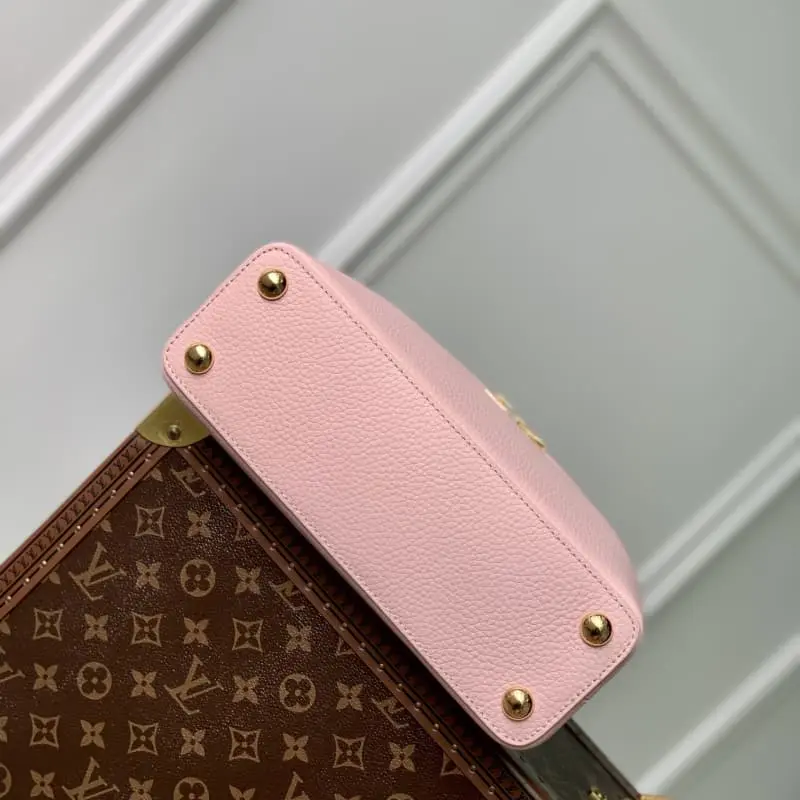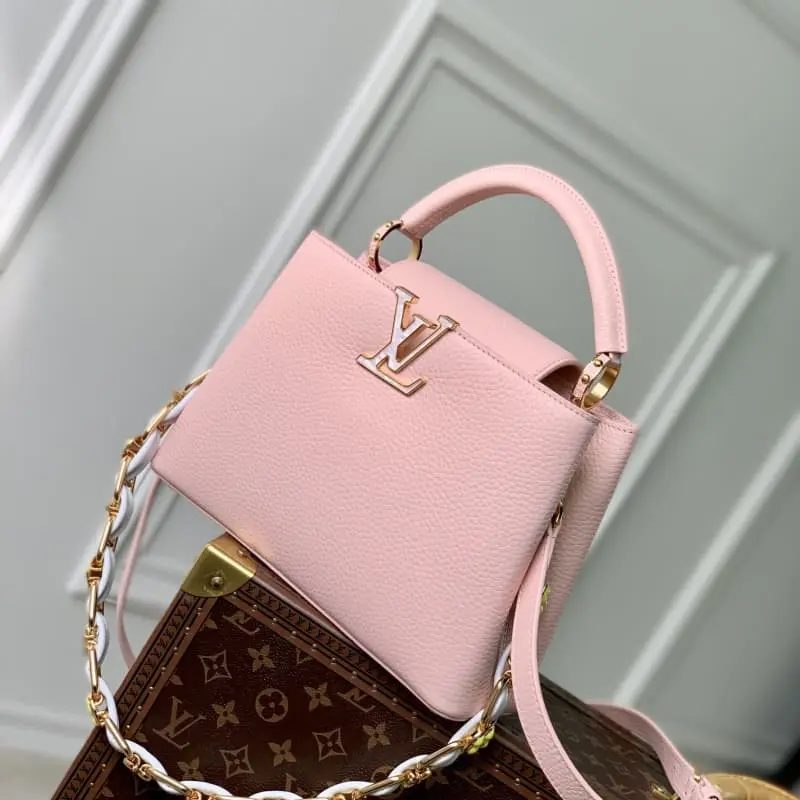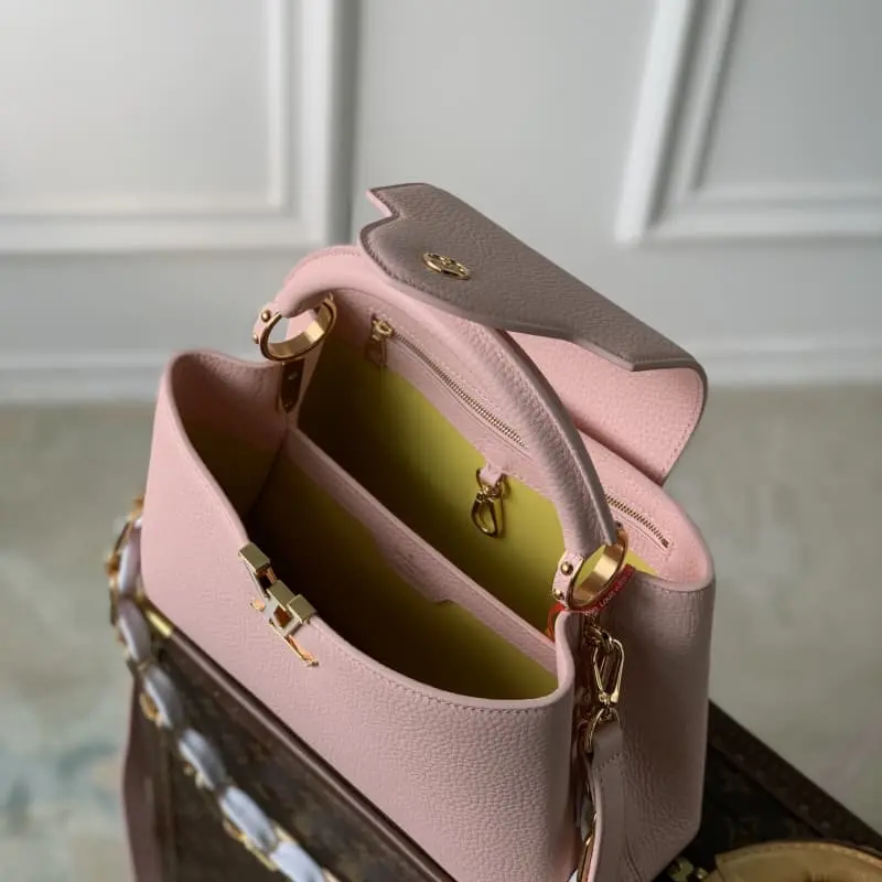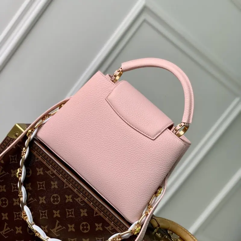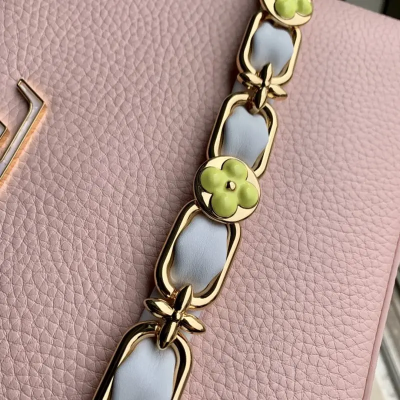 M23363 Pink Na Ying Series Capucines Medium Handbag M48865 This season’s new Capucines handbag highlights femininity. Metal links and elegant soft cowhide leather are woven into exquisite chains. Enamel and veneer Monogram Dhlo flowers are scattered on them. The enamel brand logo highlights the jewelry texture and makes the handbag even more beautiful. Size: 27 x 18 x 9 cm