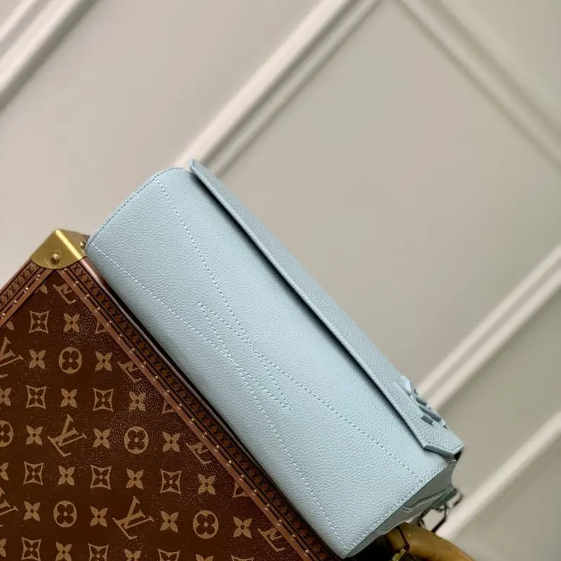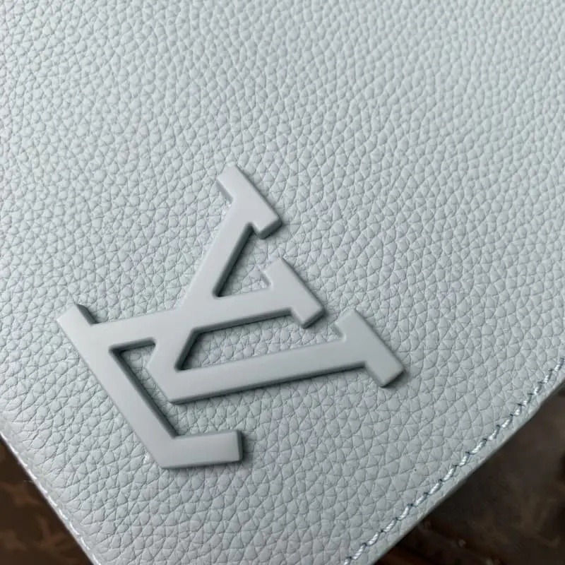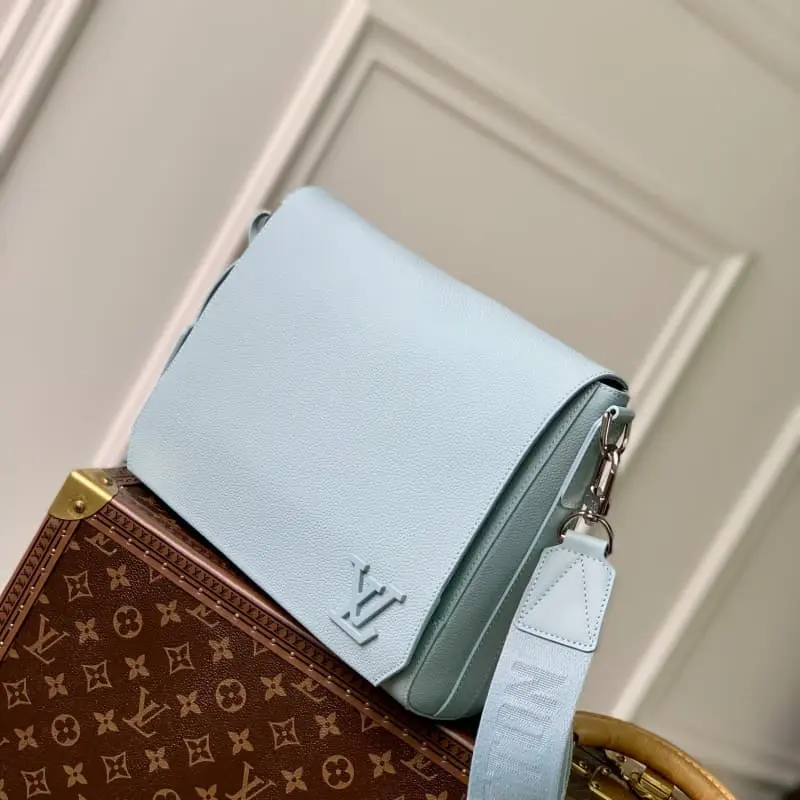 M23709 Light Blue NEW MESSENGER Messenger Bag This messenger bag uses LV Aerogram cowhide leather to show the soft texture of old airmail letters, paying tribute to Lbag’s travel heritage. The metal LV letters and jacquard shoulder straps are derived from the brand’s traditional hard case urban style to convey a wise style. Size: 28 x 24 x 10 cm