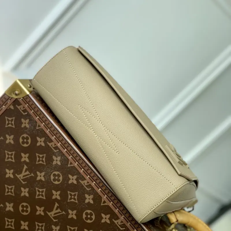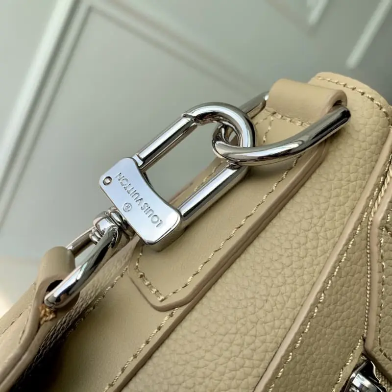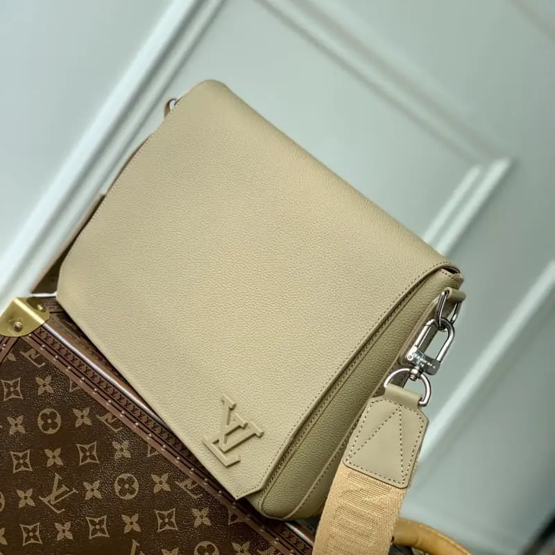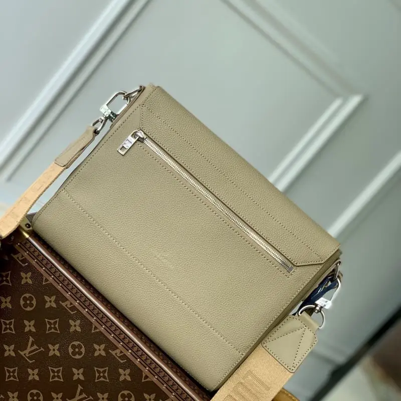 M23709 NEW MESSENGER MESSENGER BAG IN EARTH This messenger bag uses LV Aerogram cowhide leather to show the soft texture of old airmail letters, paying tribute to Lbag’s travel heritage. The metal LV letters and jacquard shoulder straps are derived from the brand’s traditional hard cases, conveying a smart style in an urban style. Size: 28 x 24 x 10 cm