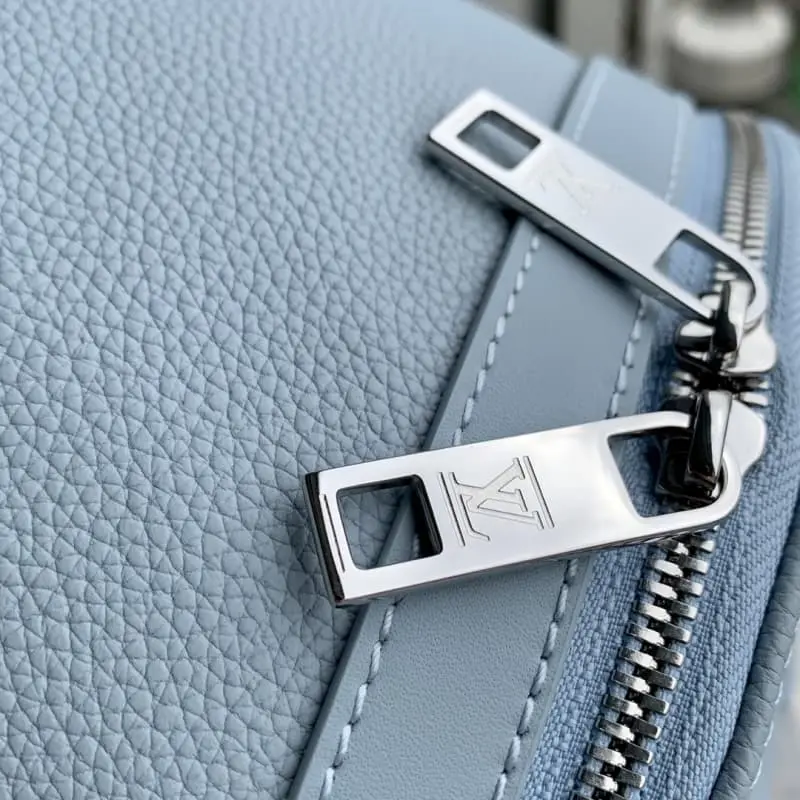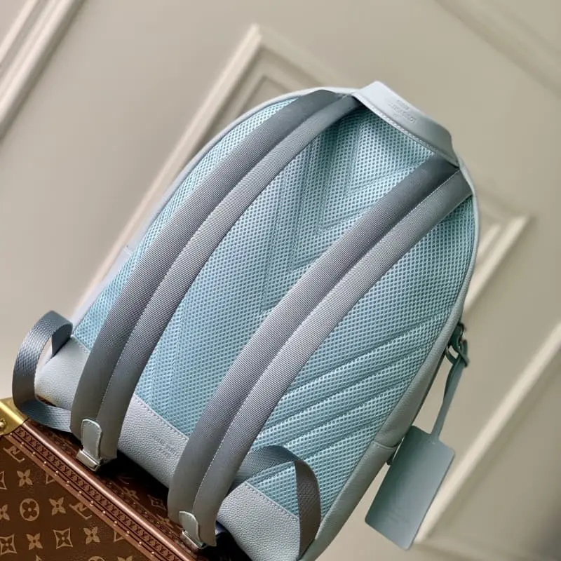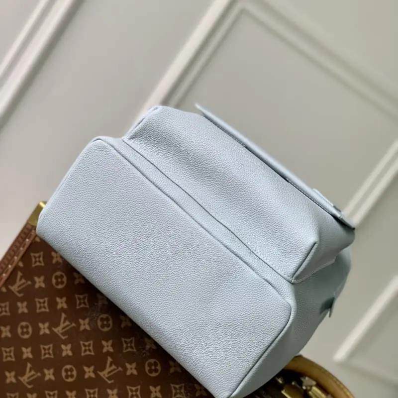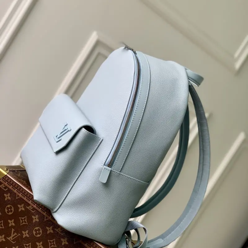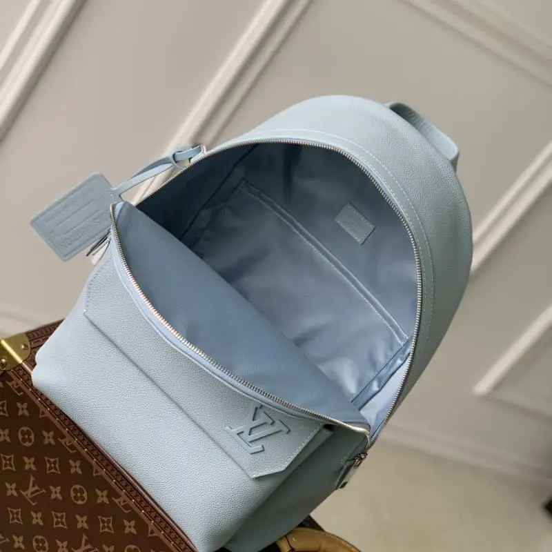 M23735 Light Blue This Takeoff backpack is made of grained cowhide leather to create a simple and modern configuration while taking into account functional considerations. The metal LV letters embellish the solid color of the bag. The front pocket flap, beveled corners and chic embossed name brand highlight the iconic design of LV Aerogram. 30.0 x 43.0 x 14.0 cm (length x height x width)