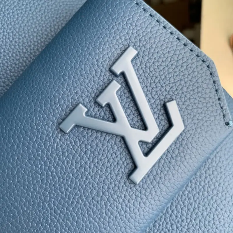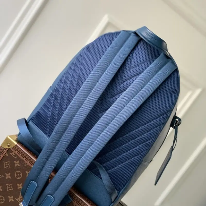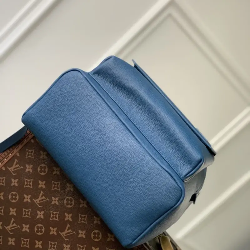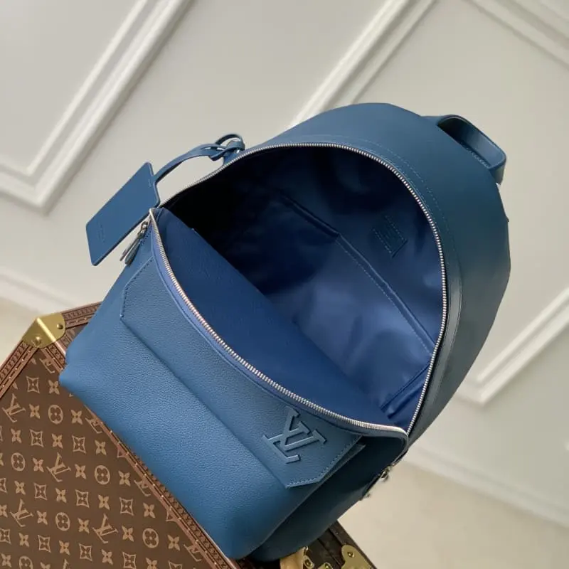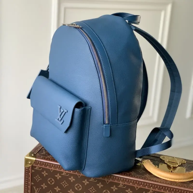 M23735 Blue This Takeoff backpack is made of grained cowhide leather to create a simple and modern configuration while taking into account functional considerations. The metal LV letters embellish the solid color of the bag. The front pocket flap, beveled corners and chic embossed name brand highlight the iconic design of LV Aerogram. 30.0 x 43.0 x 14.0 cm (length x height x width)