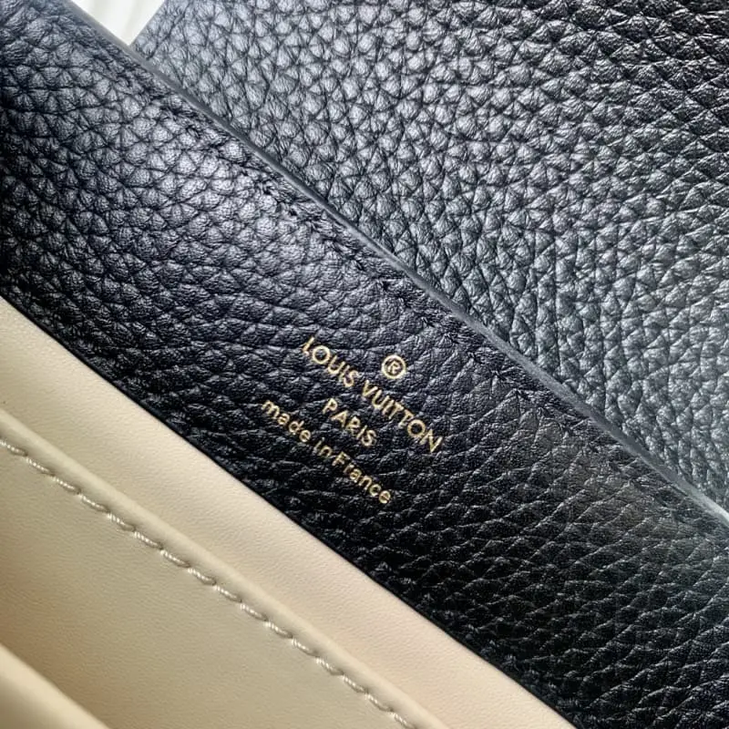 M23950 Mini This Capucines mini bag features a gorgeous Lovelock braided chain with links connecting the hand-painted enamel Monogram elements and the LV inscription padlock. Contrasting leather builds the iconic LV logo, and the elegant atmosphere is self-evident. 21??14??8 cm (length x height x width)