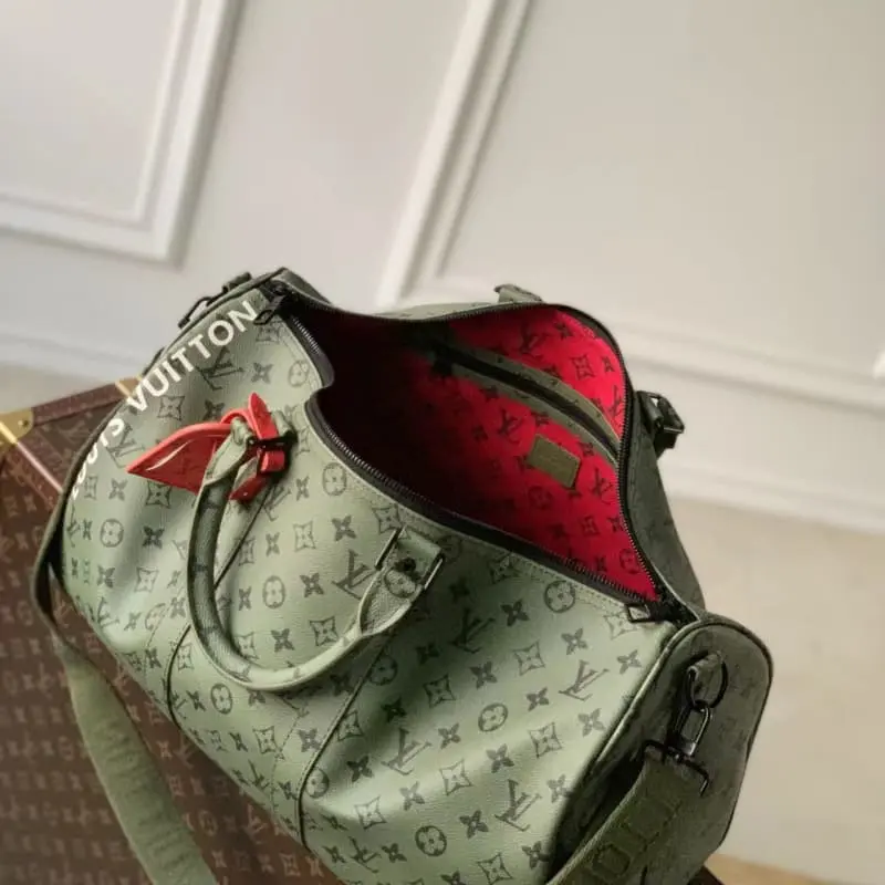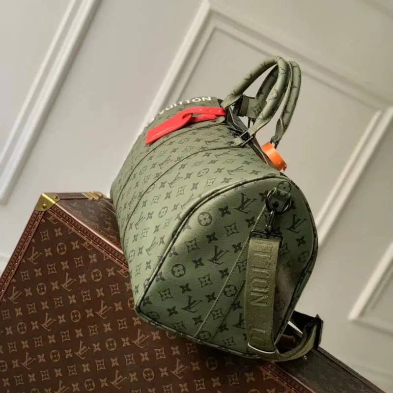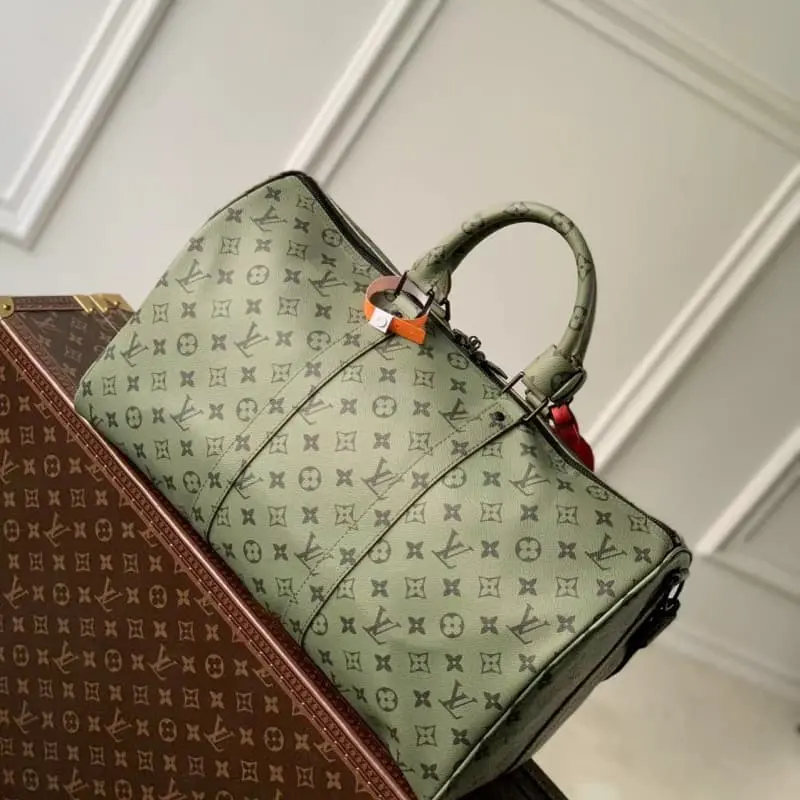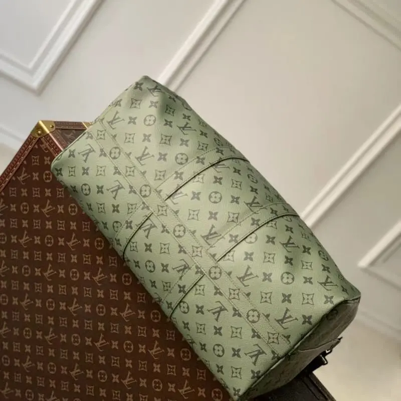 M23963 Green Silkscreen Travel Bag Series This Keepall Bandouli??re 45 travel bag is from the Monogram Tones series. The fresh autumn colors and bright Monogram pattern inject a trendy style into the Monogram canvas. The vertical Lbag logo marks the brand imprint. The removable and adjustable shoulder strap allows for comfortable shoulder carrying. 45??27??20 cm