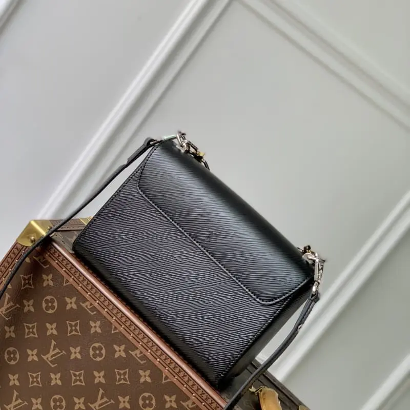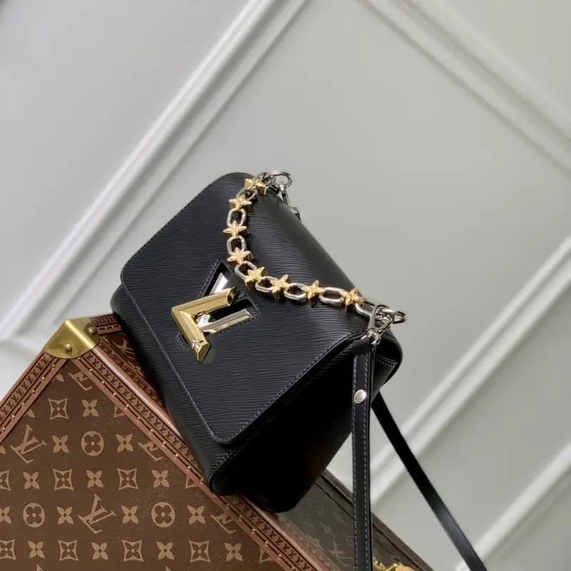 M24044 Black The Twist MM LV Bloom bag pays homage to spring with joyful new details. Crafted from Epi textured leather, it features the alluring two-tone LV Twist lock and decorative chain handles embellished with a delicate Monogram floral motif. The handbag is equipped with a detachable fashionable leather shoulder strap and a wide multi-pocket interior design, showing elegance and versatile style. 23 x 17 x 9.5 cm (length x height x width)