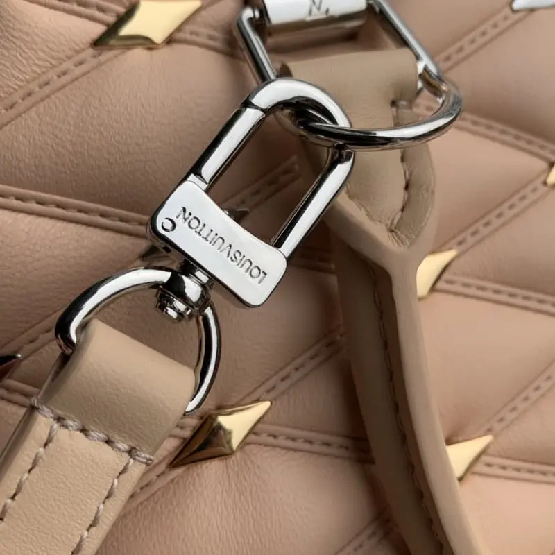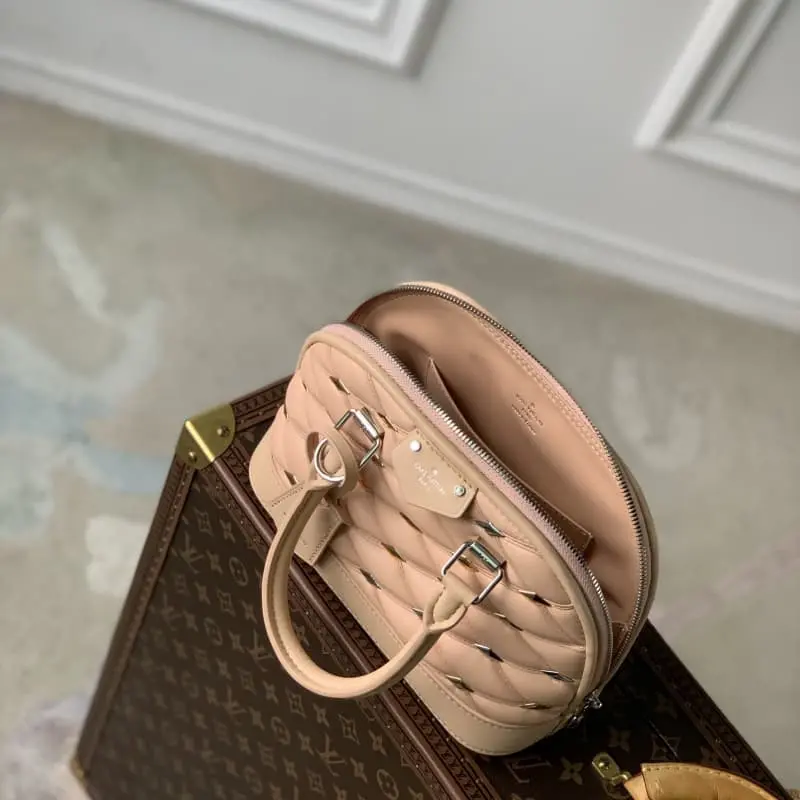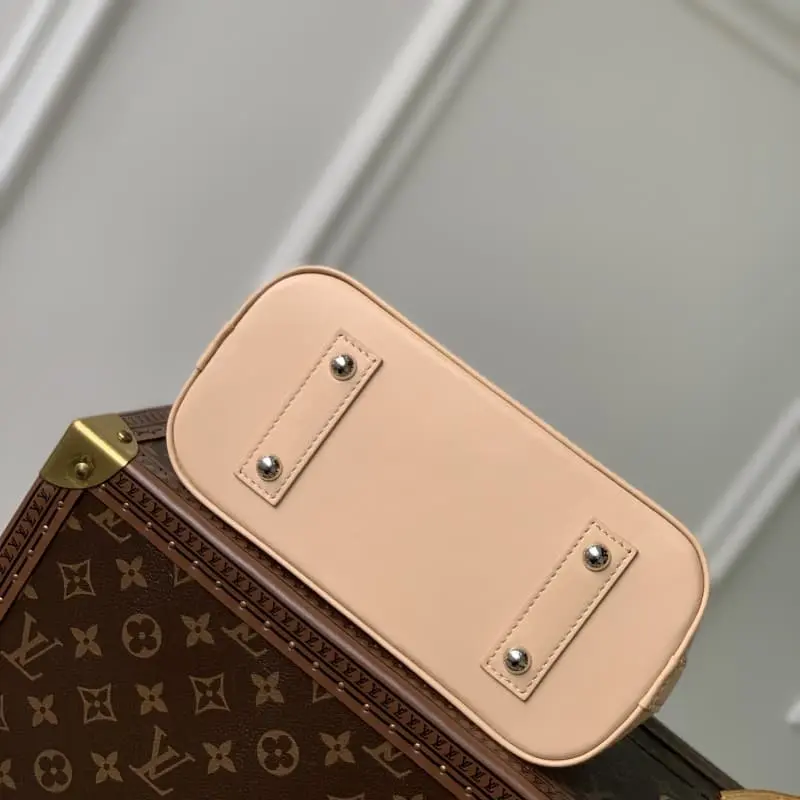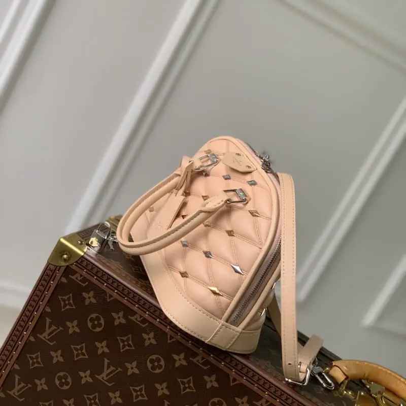 M24153 This Alma BB bag is made of diamond-grained sheepskin and embellished with shiny diamond studs, which subtly nods to the quilted lining design of the brand’s hard cases. The rolled leather handle and detachable and adjustable shoulder strap enable comfortable carrying. 23.5 x 17.5 x 11.5 cm (length x height x width)