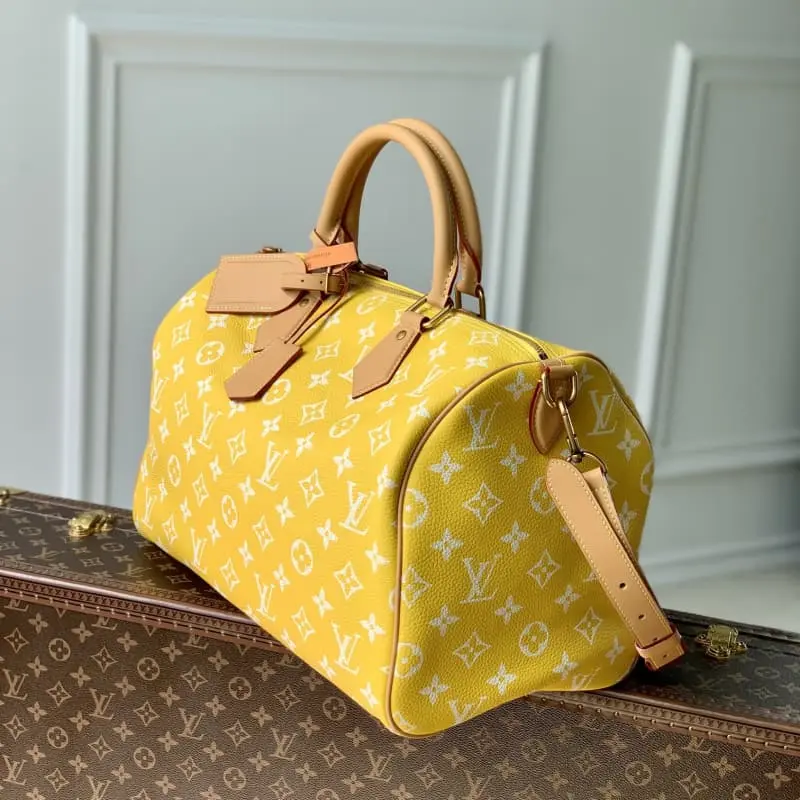 M24419 Yellow This Speedy P9 Bandouli??re 40 Monogram Leather handbag is made of soft grained cow leather wrapped with sheep leather lining. The silk-screened Monogram pattern presents the blurred look of canvas print, which shows the creative director Pharrell Williams’s new season ingenuity. 40 x 26 x 23 cm (length x height x width)