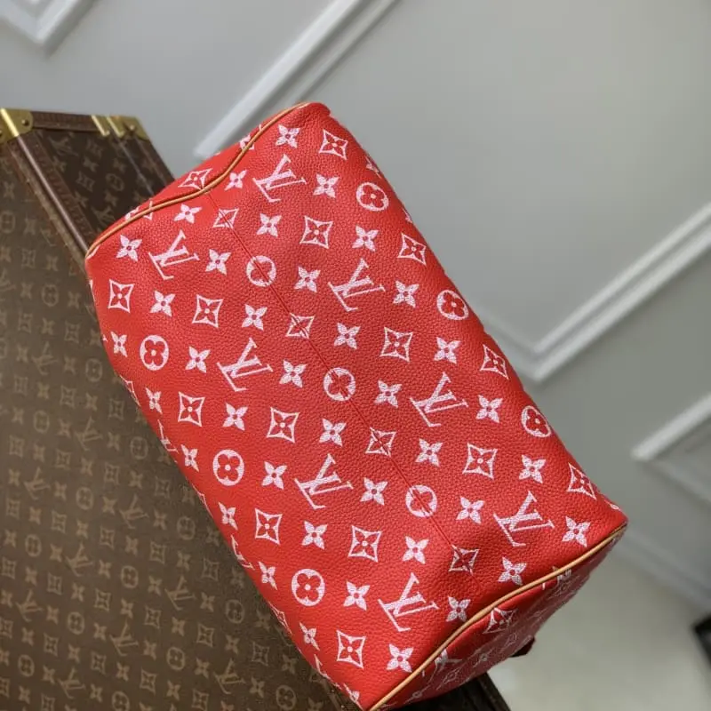 M24420 Red This Speedy P9 Bandouli??re 40 Monogram Leather handbag is made of soft grained cow leather wrapped with sheep leather lining. The silk-screened Monogram pattern presents the blurred look of canvas print, which shows the creative director Pharrell Williams’s new season ingenuity. 40 x 26 x 23 cm (length x height x width)