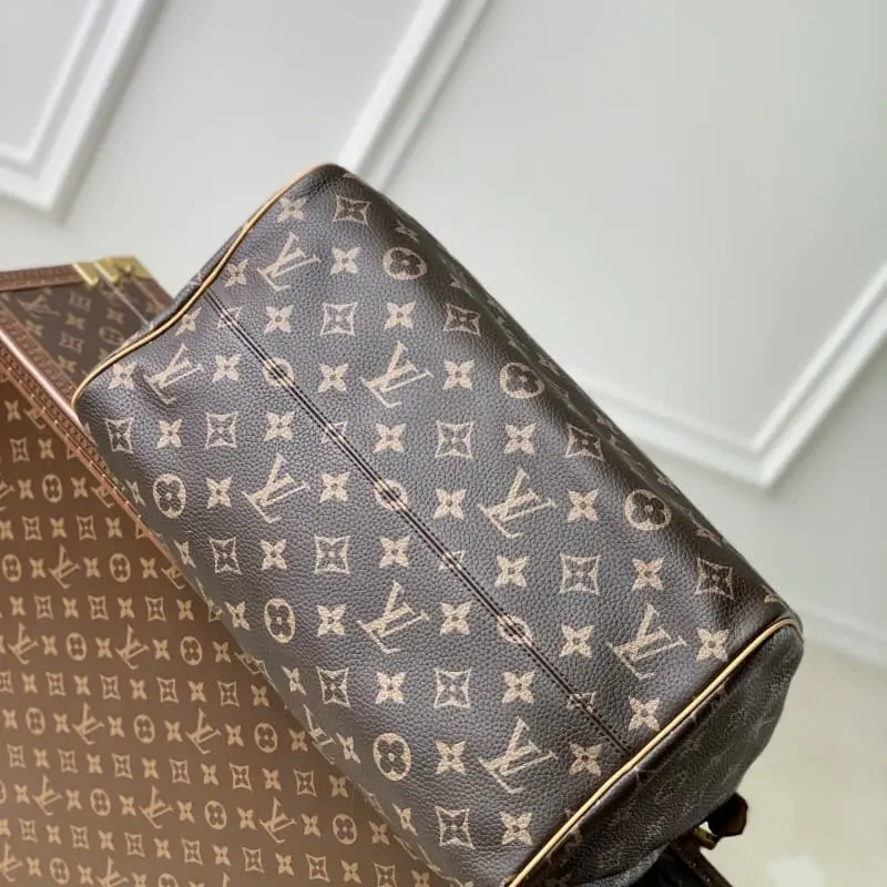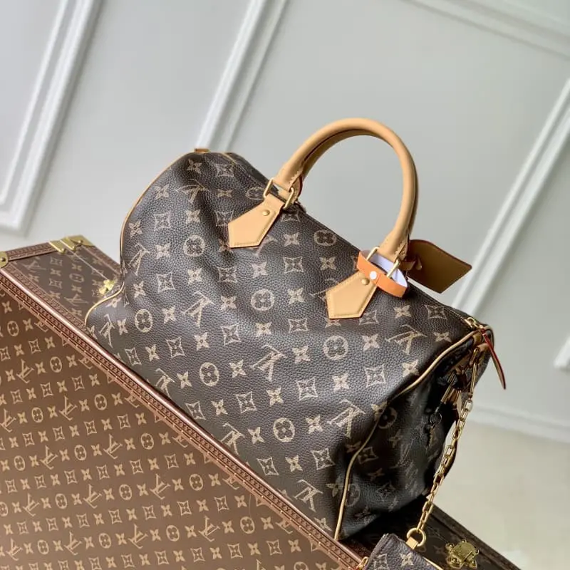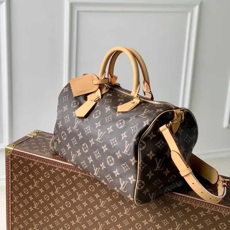 M24422 Speedy P9 Bandouli??re 40 Monogram Leather handbag is made of soft grained cow leather wrapped with sheep leather lining. The silk-screened Monogram pattern presents the blurred look of canvas print, which shows the creative director Pharrell Williams’s new season ingenuity. 40 x 26 x 23 cm (length x height x width)