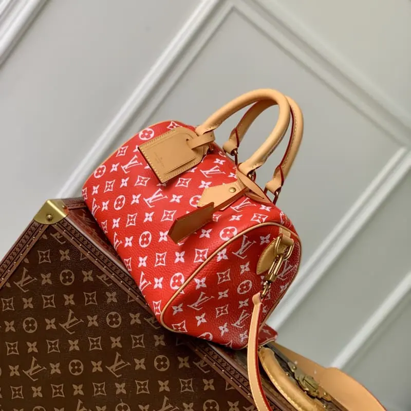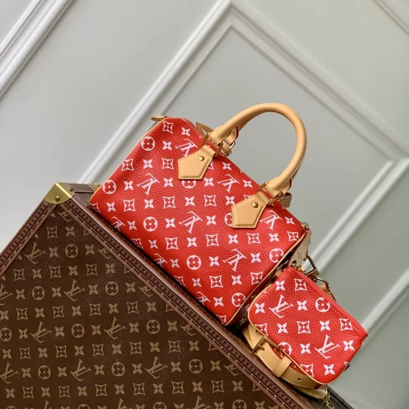 M24425 Red This Speedy P9 Bandouli??re 25 Monogram Leather handbag uses soft cowhide leather to reproduce the elegant look of canvas print with Monogram pattern. The dazzling metal parts, sheepskin lining and nameplate together confirm the creative director Pharrell Williams’s unremitting pursuit of details. 25 x 15 x 15 cm (length x height x width)