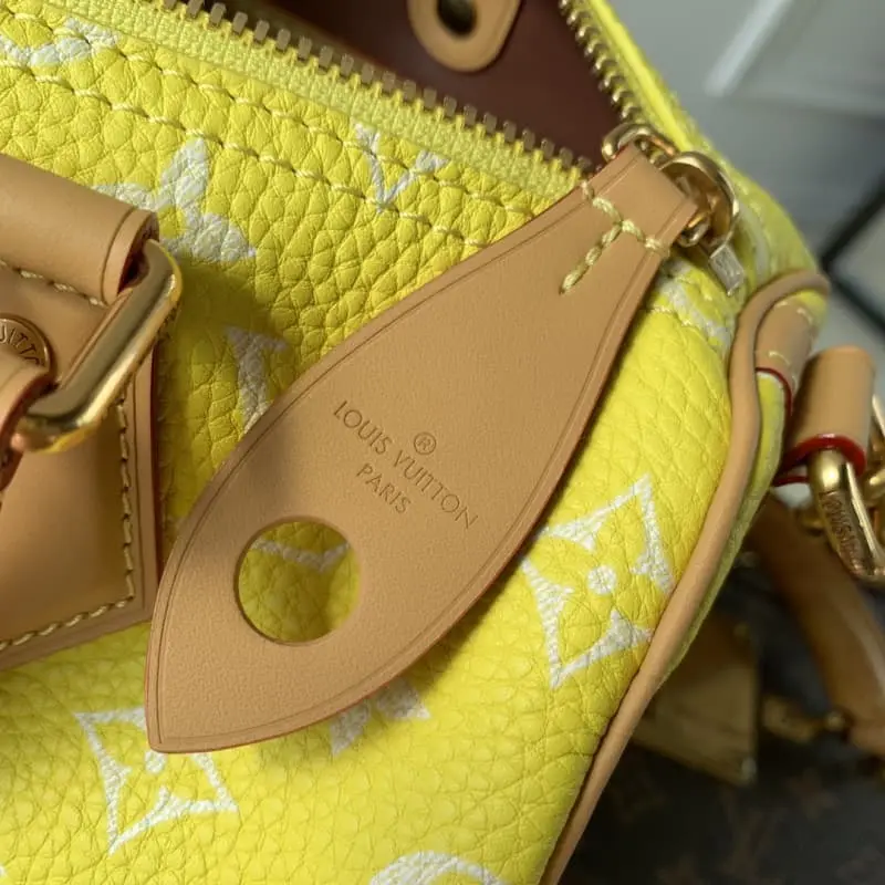 M24429 Fluorescent Yellow This Speedy P9 Bandouli??re 25 Monogram Leather handbag uses soft cowhide leather to reproduce the elegant look of canvas print with Monogram pattern. The dazzling metal parts, sheepskin lining and nameplate together confirm the creative director Pharrell Williams’s unremitting pursuit of details. 25 x 15 x 15 cm (length x height x width)