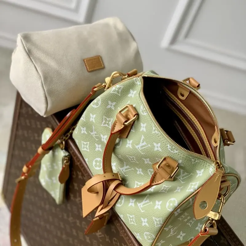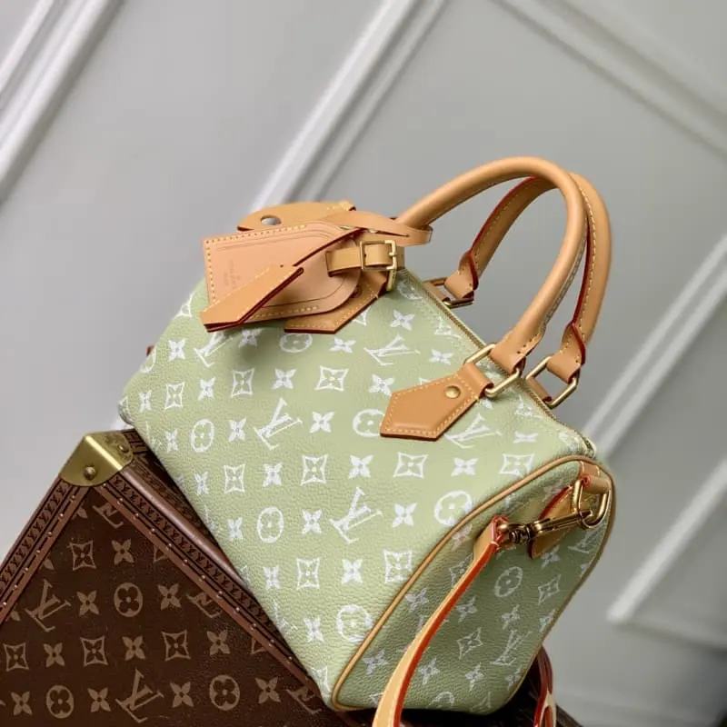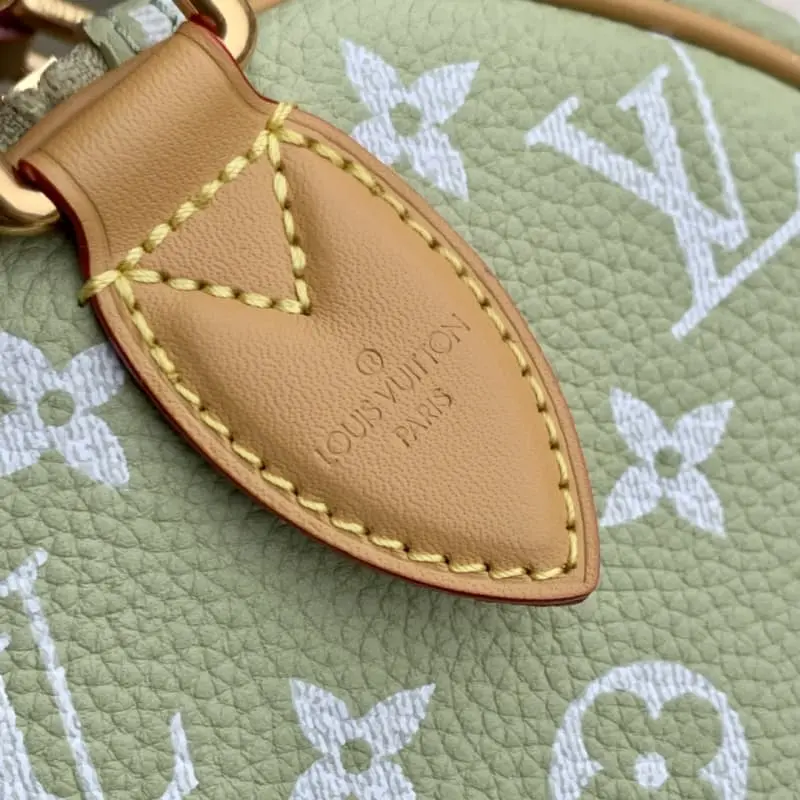 M24443 Fruit Green This Speedy P9 Bandouli??re 25 Monogram Leather handbag uses soft cowhide leather to reproduce the elegant look of canvas print with Monogram pattern. The dazzling metal parts, sheepskin lining and nameplate together confirm the creative director Pharrell Williams’s unremitting pursuit of details. 15 x 15 x 25 cm (height x width x length)