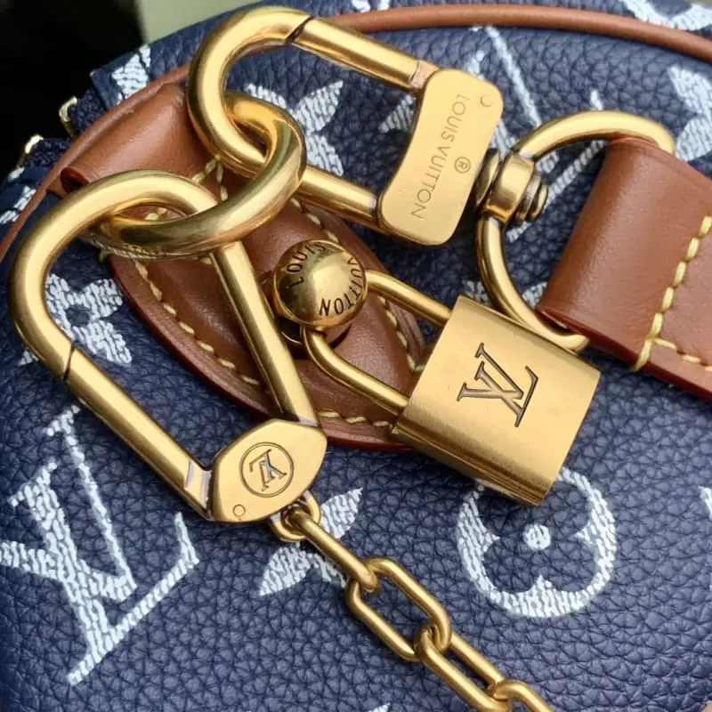 M24443 Royal Blue Speedy P9 Bandouli??re 25 Monogram Leather uses ultra-soft calfskin to create the Monogram print and create the effect of Monogram canvas, exuding the ultimate luxurious atmosphere. The bag is embellished with polished gold hardware, lambskin lining and an original plaque inside the bag, reflecting Creative Director Pharrell Williams’ meticulous attention to detail. 25 x 15 x 15 cm (length x height x width)