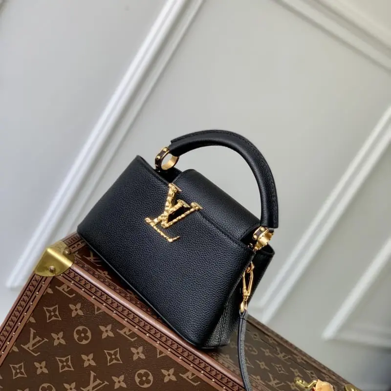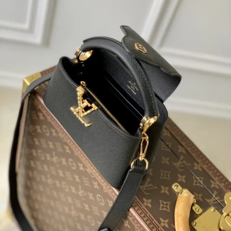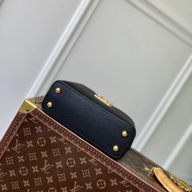 M24666 Black Mini Capucines East West Mini Handbag is made of grained cowhide leather with LV initials. The elegant structure includes compartments, zipper pockets and patch pockets for storing mobile phones, short wallets and other small items. The detachable and adjustable shoulder strap unlocks the shoulder carrying experience. 22 x 12 x 8 cm (length x height x width)