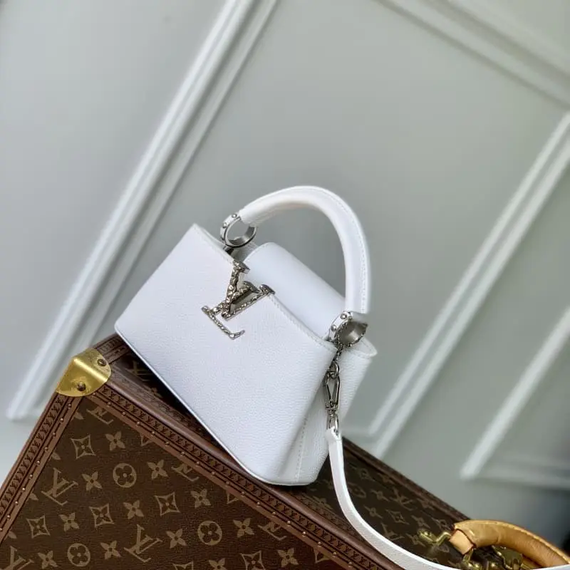 M24666 White Mini Capucines East West Mini Handbag is made of grained cowhide leather with LV letters. The elegant structure includes compartments, zipper pockets and patch pockets for storing mobile phones, short wallets and other small items. The detachable and adjustable shoulder strap unlocks the shoulder carrying experience. 22 x 12 x 8 cm (length x height x width)