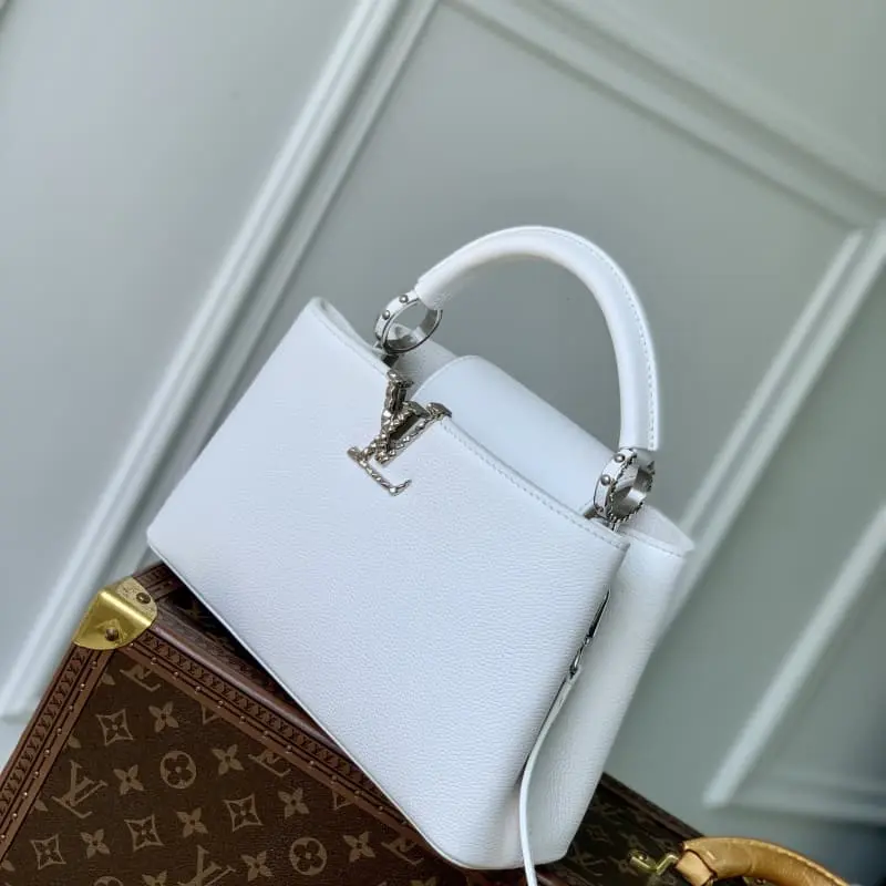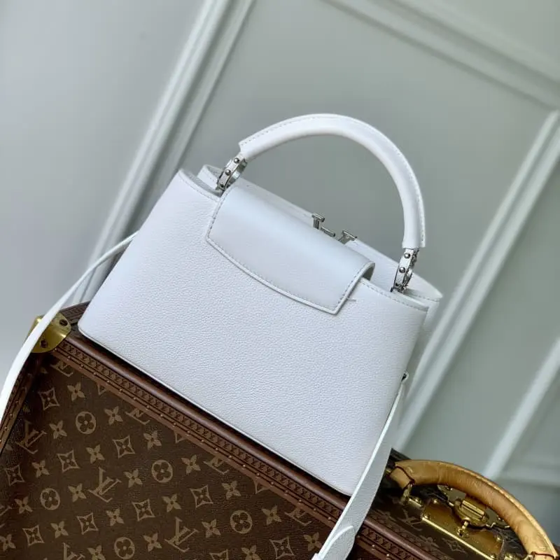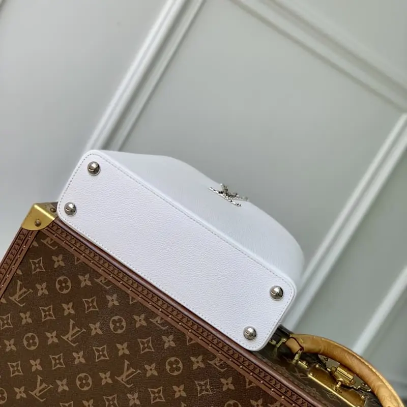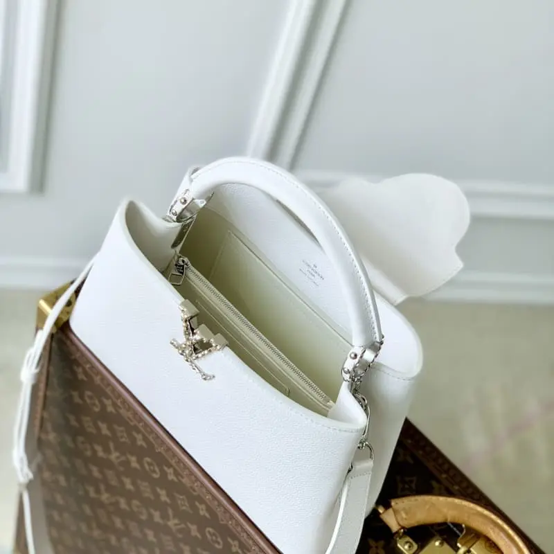 M24666 Small White Capucines East West Mini Bag is made of grained cowhide leather with LV initials. It has an elegant design with compartments, zippered pockets and patch pockets for storing mobile phones, short wallets and other small items. The detachable and adjustable shoulder strap unlocks the shoulder carrying experience. 29 x 17 x 9 cm (length x height x width)