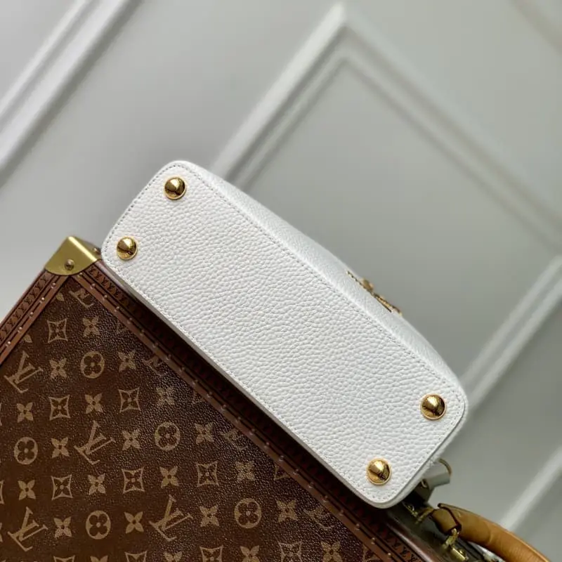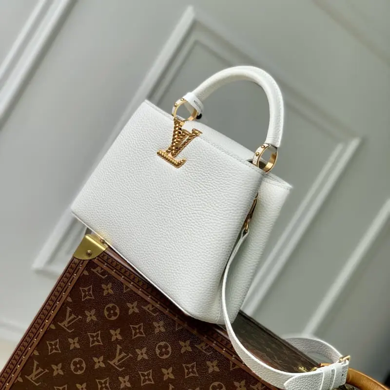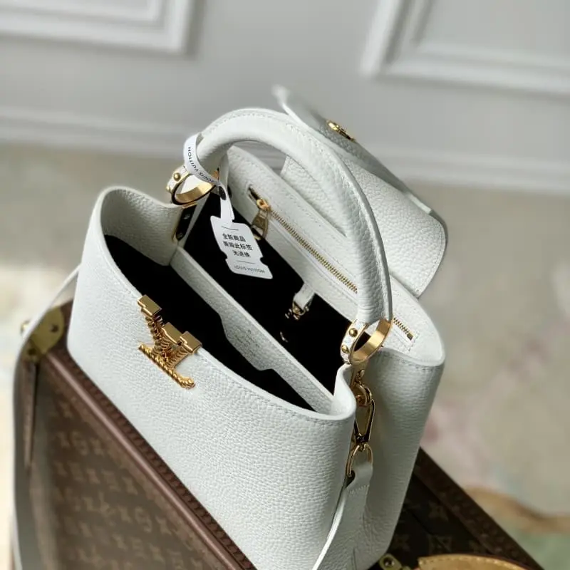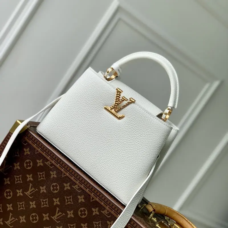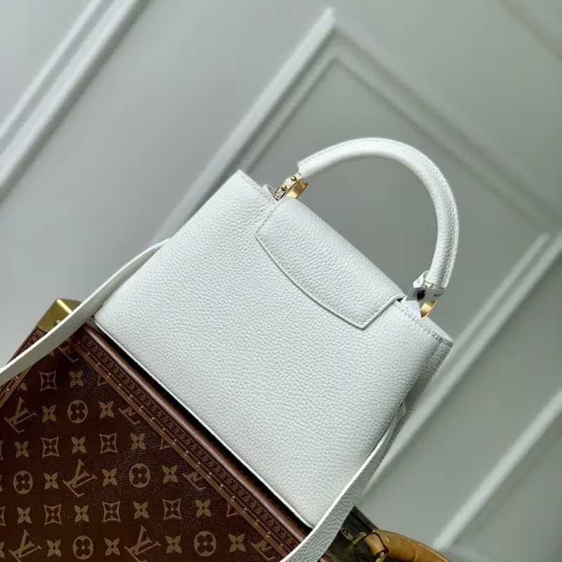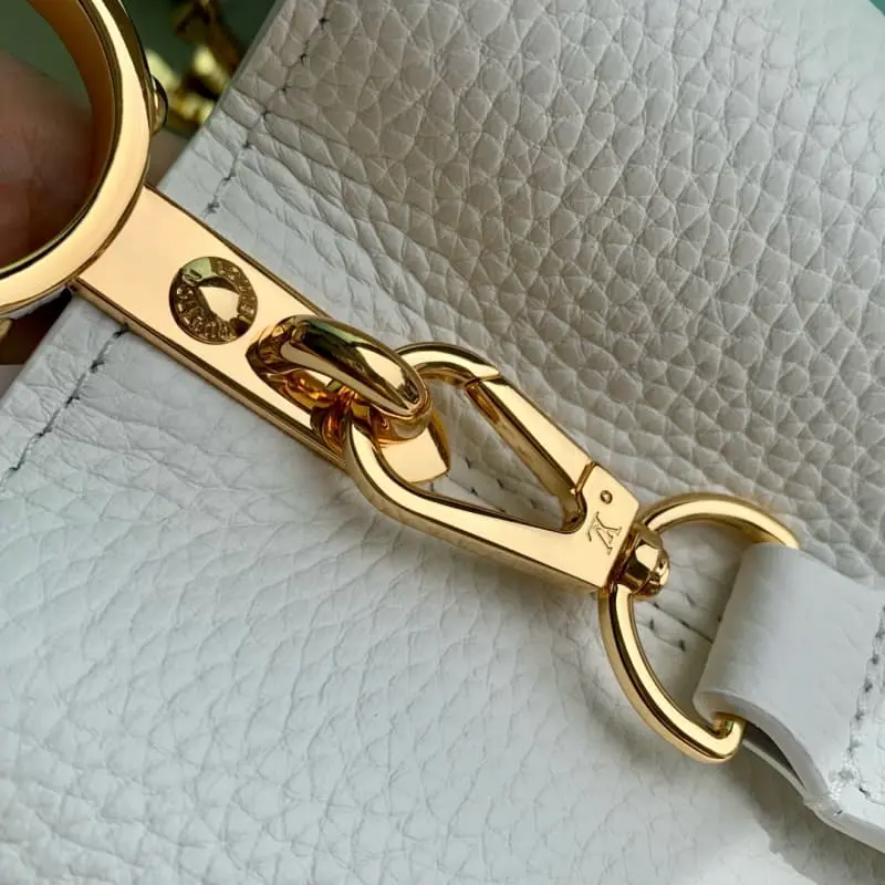M24673 Small White Capucines handbag from the Nautical series. Made of Taurillon cowhide leather, it incorporates multiple nautical elements: the dazzling LV letters on the front, the boat chain design, and the scarf wrapped around the top handle pay tribute to the deep ocean. The detachable and adjustable shoulder strap is convenient for shoulder and crossbody. 27??18??9cm