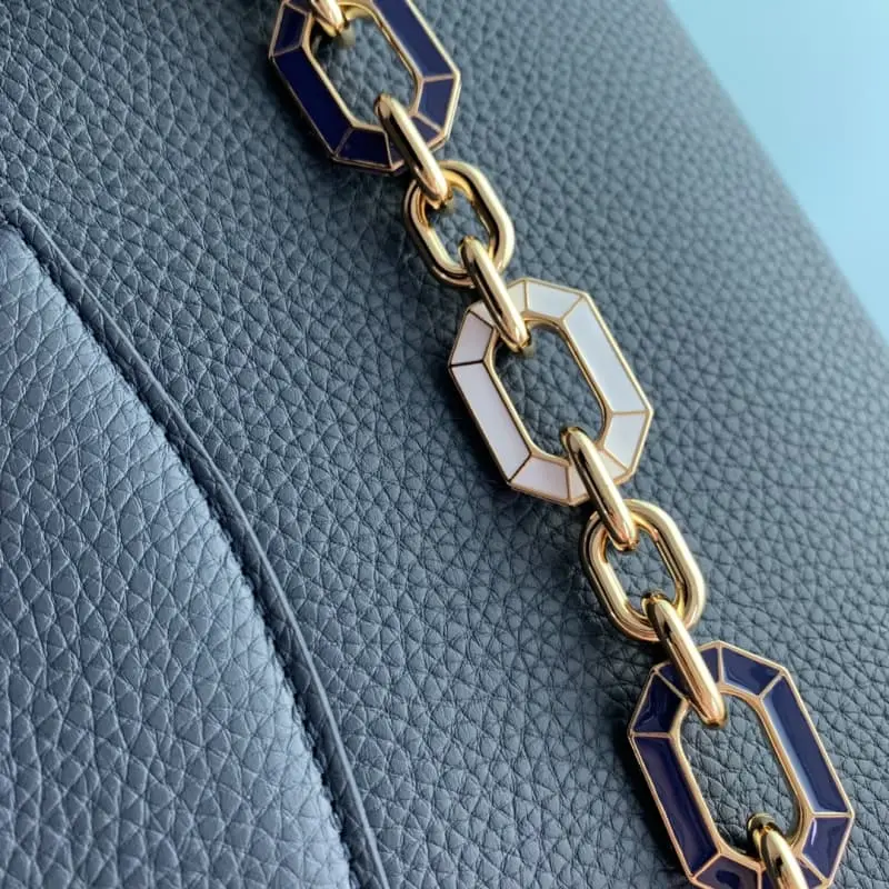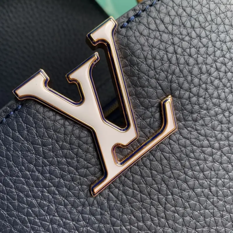M24683 Dark Blue Small This Capucines small handbag is made of bright Taurillon leather. The octagonal links of the delicate chain are inlaid with colorful enamel to illustrate the design concept of Art Deco. The 3D LV letters add a fresh touch. 21??14??8cm (length x height x width)