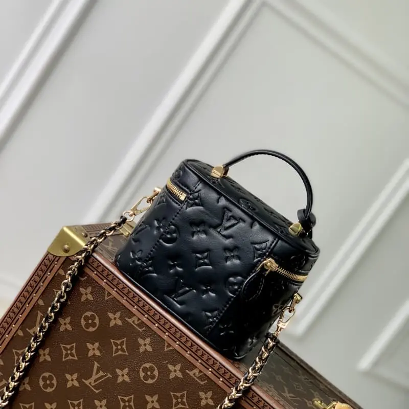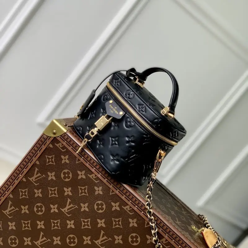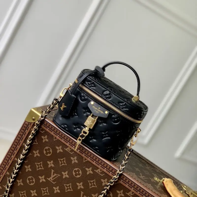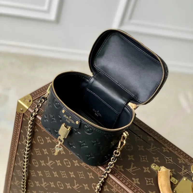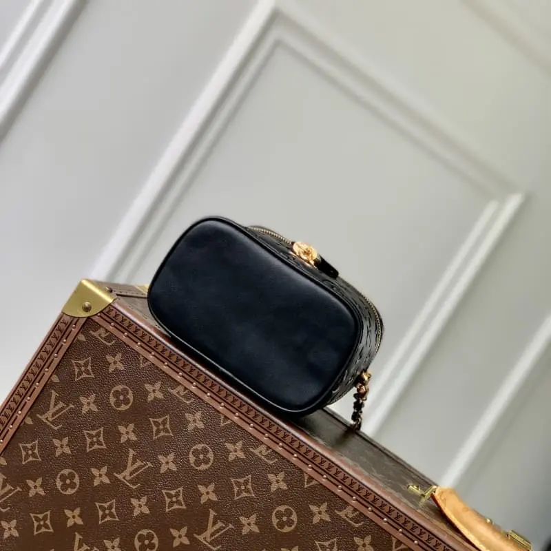 M25123 This small Vanity bag is made of fluffy lambskin leather. It interprets Nicolas Ghesqui??re’s new interpretation of urban handbags with a soft and light design. The dazzling LV padlock and leather key holder mark the brand identity. The detachable braided leather chain is convenient for hand, shoulder or crossbody. 19 x 13 x 11 cm (length x height x width)