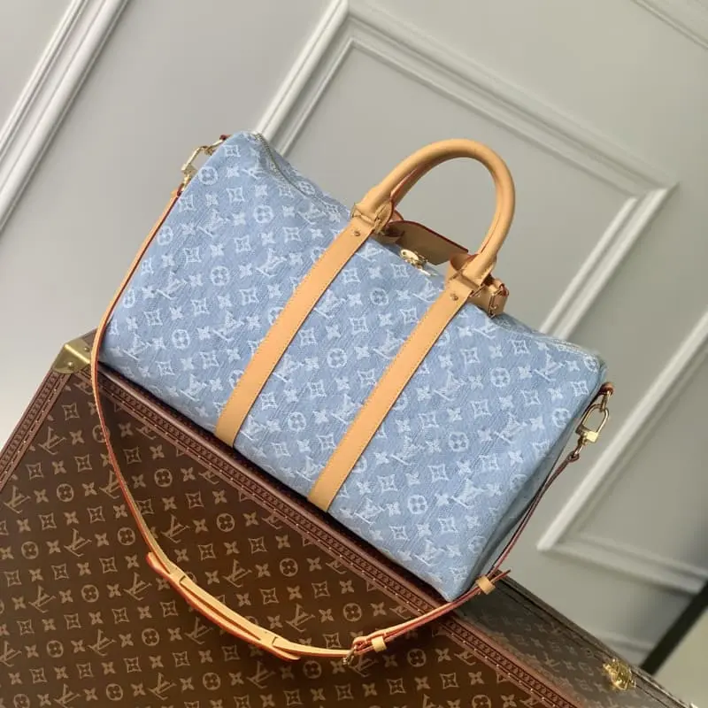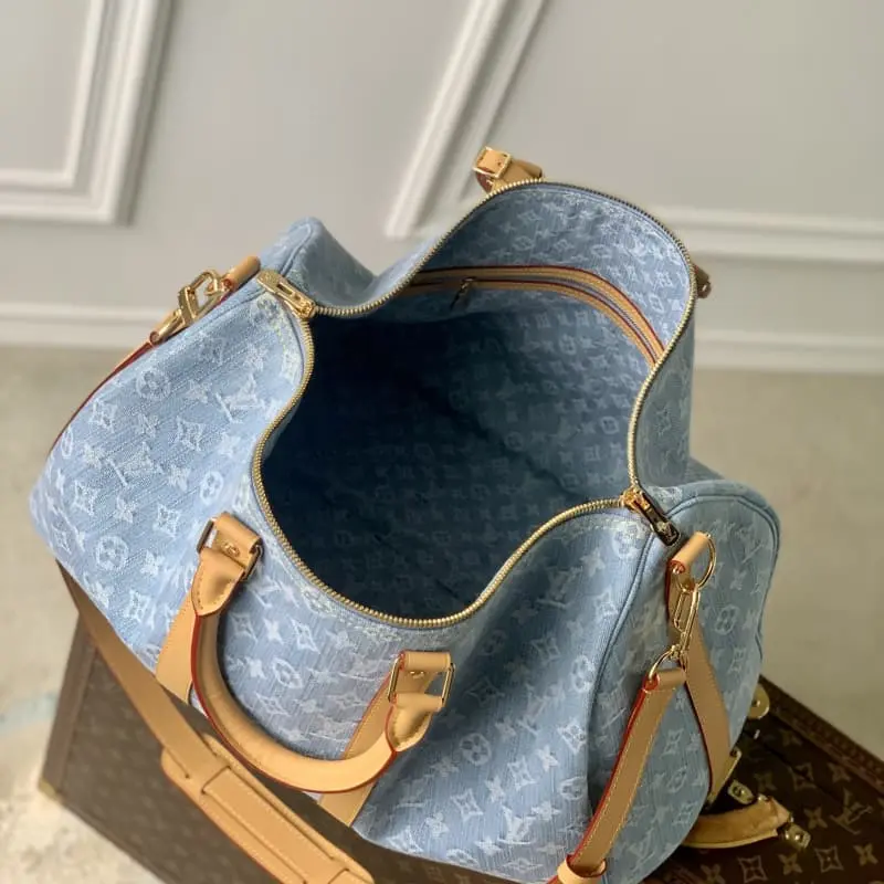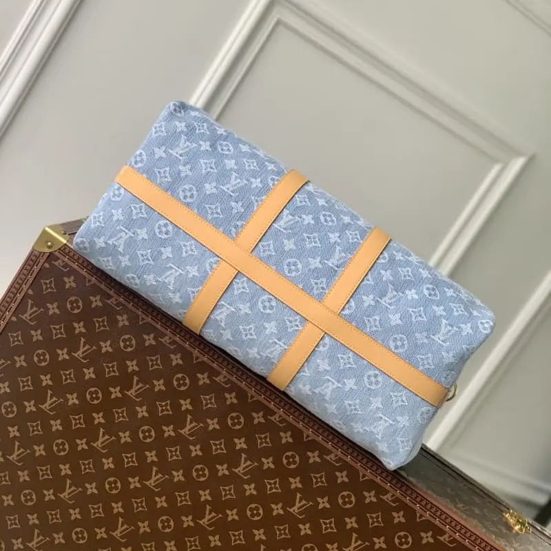 M25334 The Keepall Bandouli??re 45 travel bag is ready for summer in Monogram Denim: the Monogram pattern is woven from cotton and sand-washed for a chic look. The cowhide details on the side reinforcements and removable shoulder straps add a touch of sophistication. The gift box packaging for this product may vary depending on stock availability and may differ from the packaging style shown on this product page. Please refer to the actual gift box packaging style received. 45 x 27 x 20 cm (length x height x width)