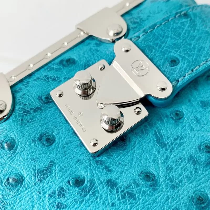 M25445 Royal Blue Ostrich Pattern This Slim Trunk handbag draws inspiration from Lbag’s traditional hard cases. The soft cowhide leather is combined with rivet frames and metal S-lock buckle to highlight the avant-garde rock style. The shiny chain and adjustable leather shoulder strap are both detachable to provide a variety of carrying options. 23 x 12 x 4 cm (length x height x width)