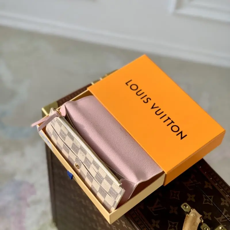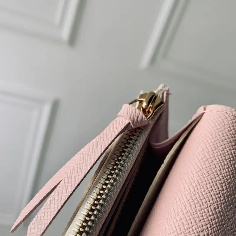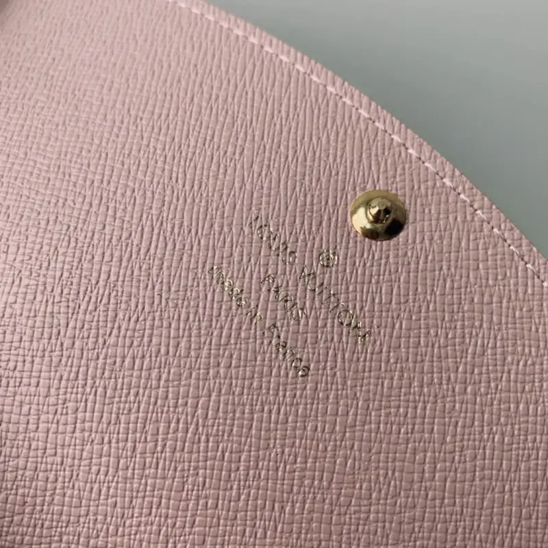 M41625 Gold buckle white and pink Emilie wallet is made of soft Monogram canvas with brightly colored lining. It is extremely elegant. The multi-pocket design and eye-catching shape give it an irresistible charm. Size: 19x10cm.
