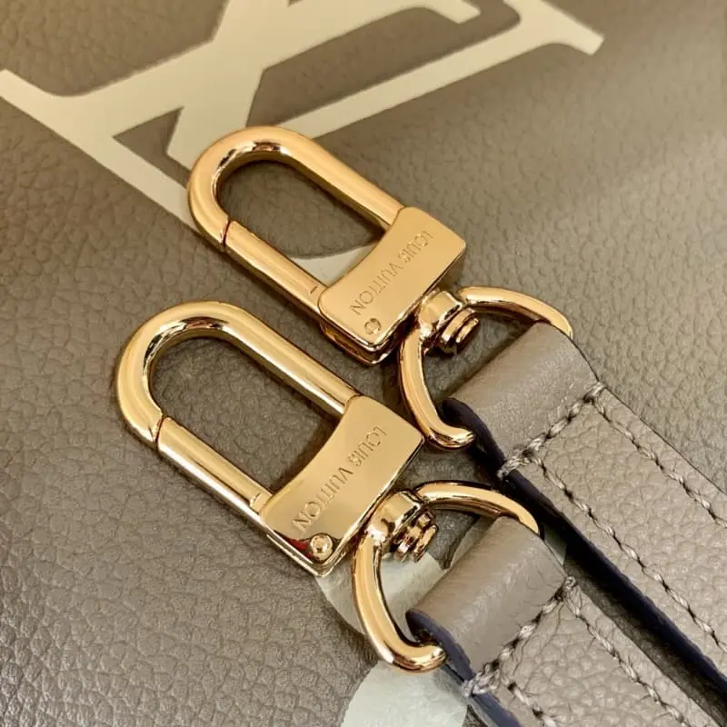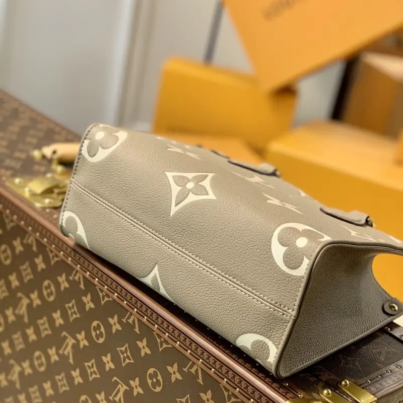 ONTHEGO Small HandbagM45659 Grey Onthego Small Tote Bag draws inspiration from the classic Sac Plat handbag of 1968. This miniature version is made of Monogram Empreinte leather with Giant Bicolor Monogram pattern. It can store iPad Mini and other daily necessities. Flexible handles and detachable shoulder strap provide rich carrying options. Size: 25x19x11.5cm