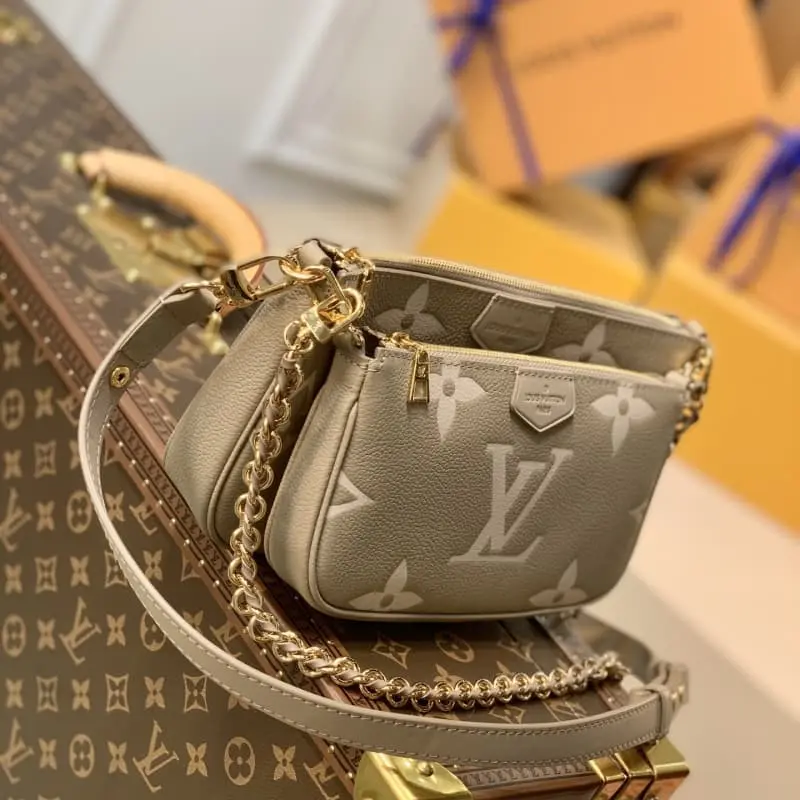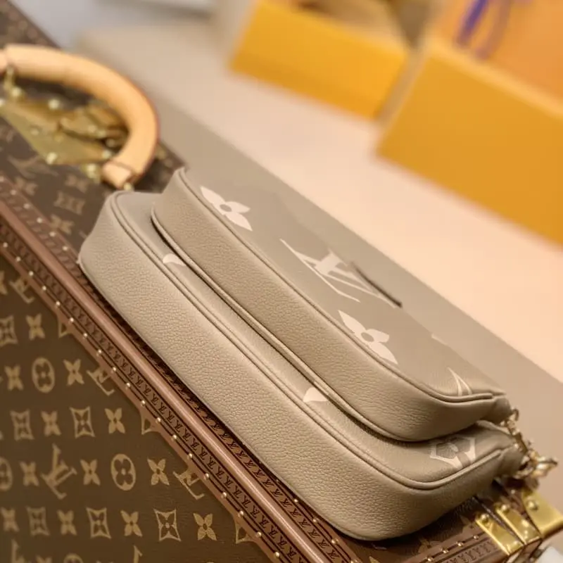 The M45777 Multi Pochette Accessories bag is a three-in-one dynamic design in Monogram canvas with multiple pockets and compartments. The adjustable gold chain and Lbag jacquard shoulder strap provide multiple carrying methods such as crossbody. Dimensions: 24 x 13.5 x 4 cm