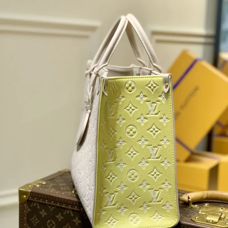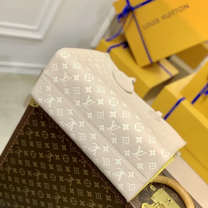 Original M46128 Pink This OnTheGo handbag is made of Monogram Empreinte cowhide leather. The classic Monogram pattern is embossed and printed on the dazzling leather body. There is plenty of space to accommodate a laptop. The long and short handles provide a variety of carrying methods. Dimensions: 35.0 x 27.0 x 14.0 cm (length x height x width)